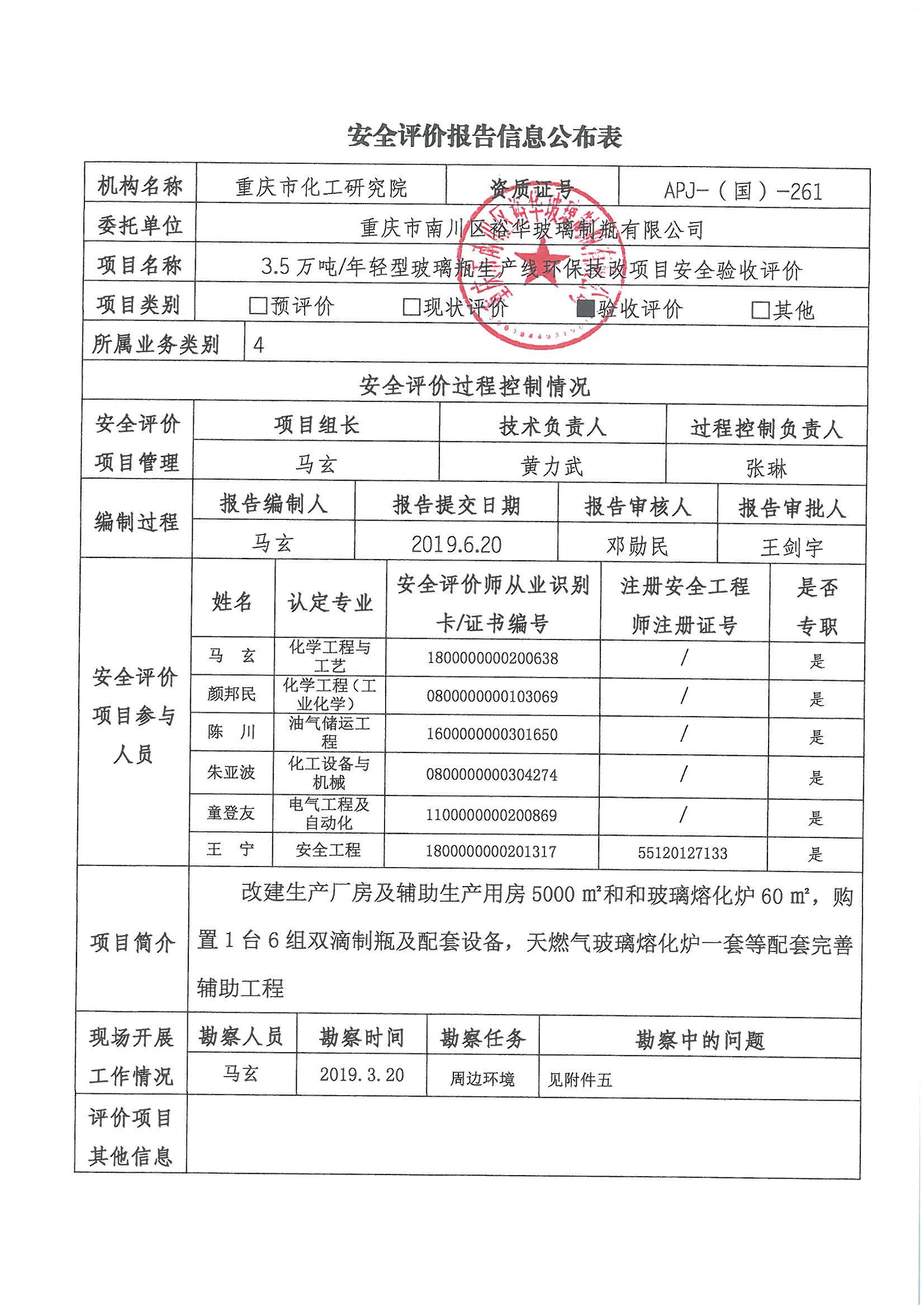 2019年第3季度重庆市南川区裕华玻璃制瓶有限公司3.5万吨年轻型玻璃瓶生产线环保技改项目安全验收评价