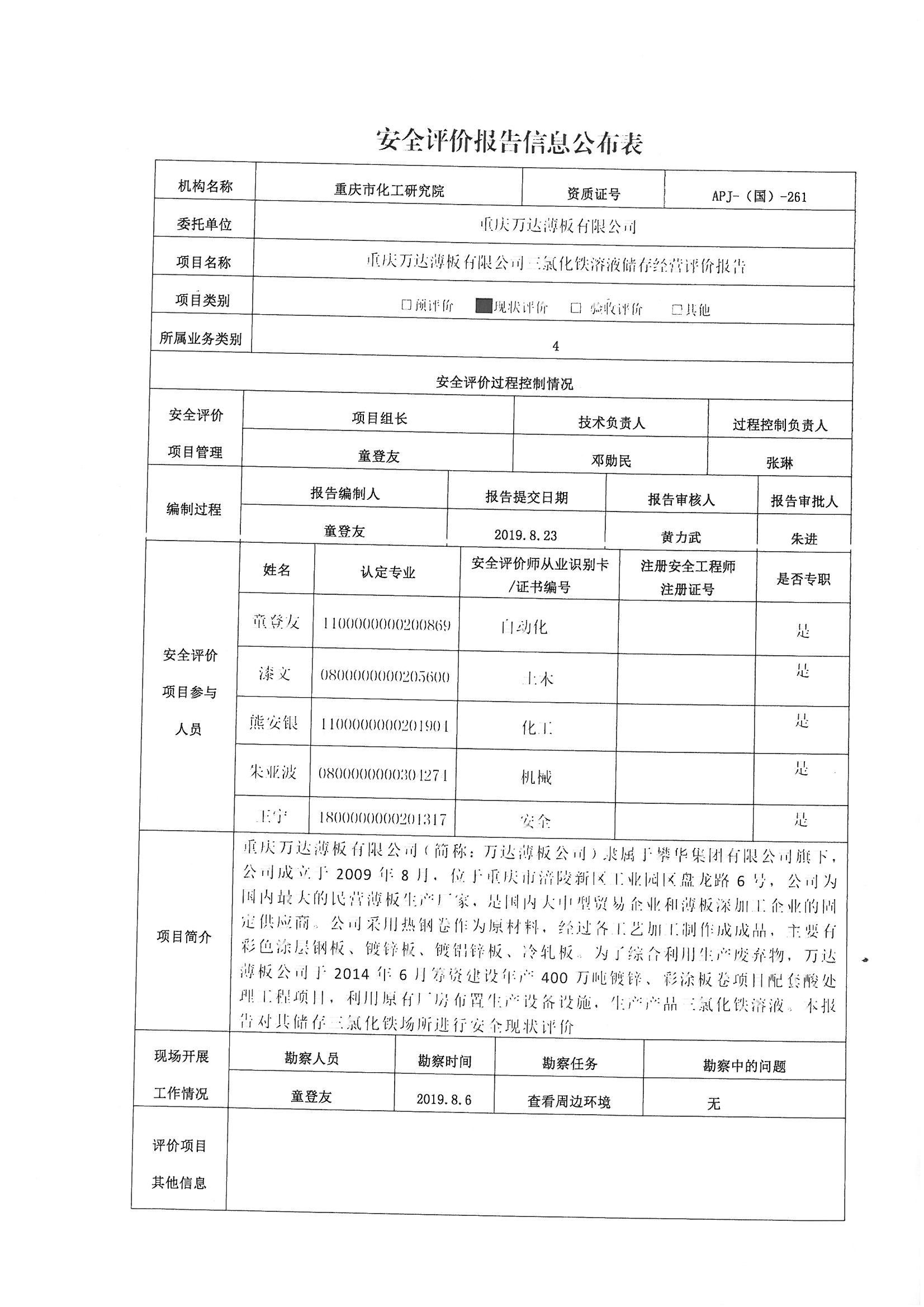 2019年第3季度重庆万达薄板有限公司三氯化铁溶液储存经营评价安全现状评价