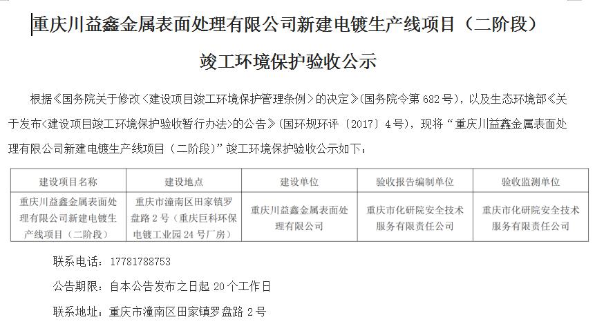 重庆川益鑫金属表面处理有限公司新建电镀生产线项目(二阶段) 竣工环境保护验收