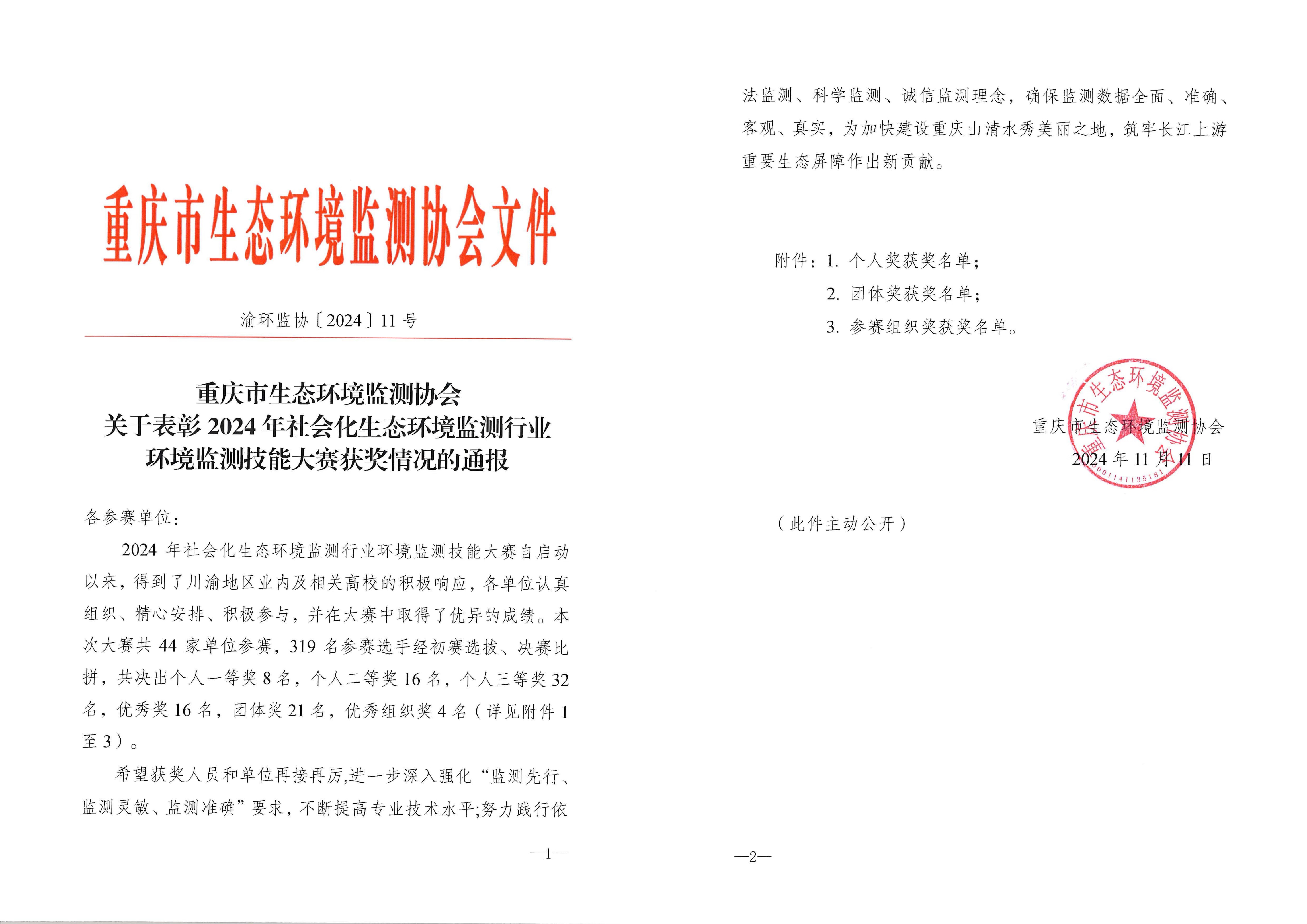 近日,重庆市生态环境监测协会通报了2024年社会化生态环境监测行业环境监测技能大赛获奖情况。在此次竞赛中,重庆市彩德网安全技术服务有限责任公司凭借其卓越的表现,荣获社会环境监测机构类别团体奖二等奖。此外,检测中心员工也在个人奖项中分别斩获了个人二等奖与三等奖。