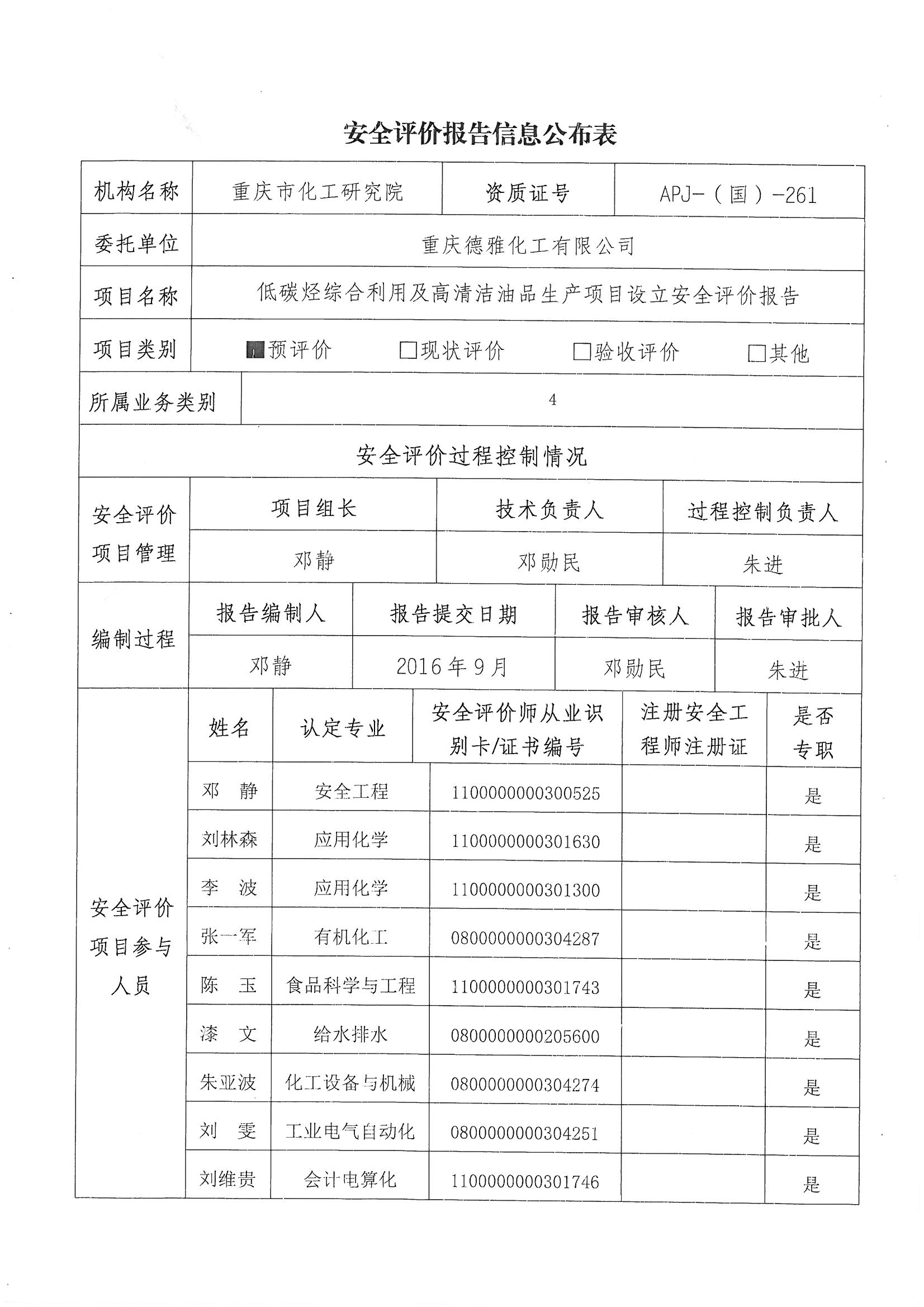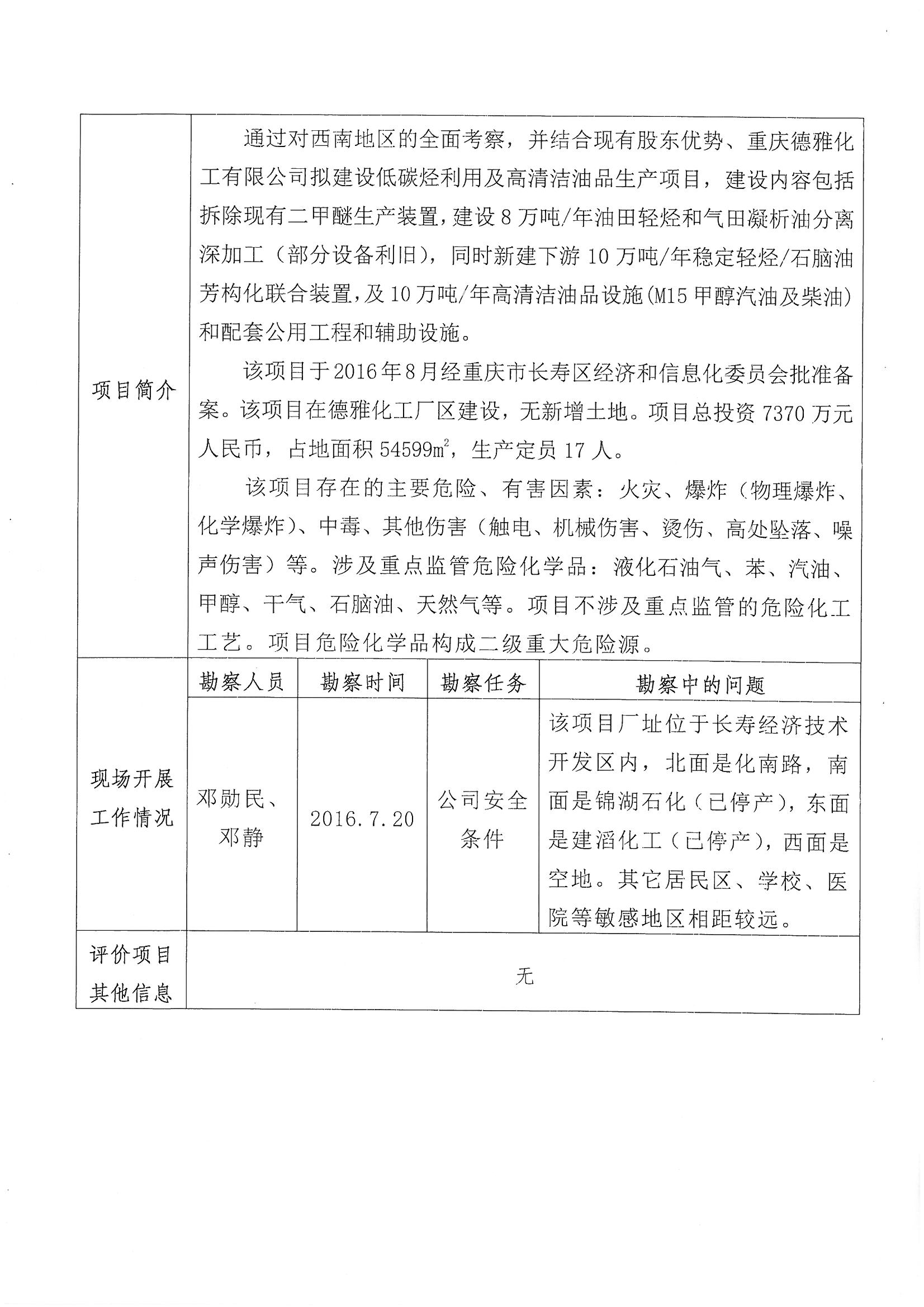 2016年3季度重庆德雅化工有限公司低碳烃综合利用及高清洁油品生产项目设立安全评价报告信息公布表