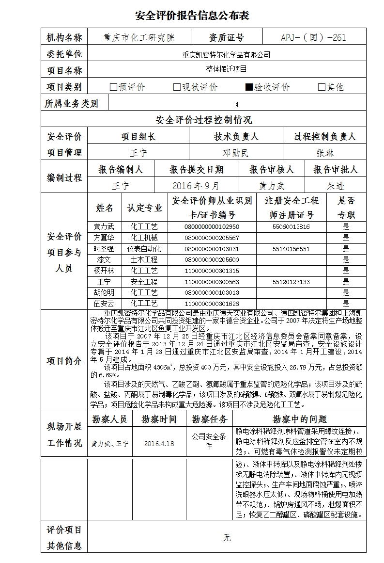 2016年3季度重庆凯密特尔化学品有限公司整体搬迁项目验收安全评价信息公布表