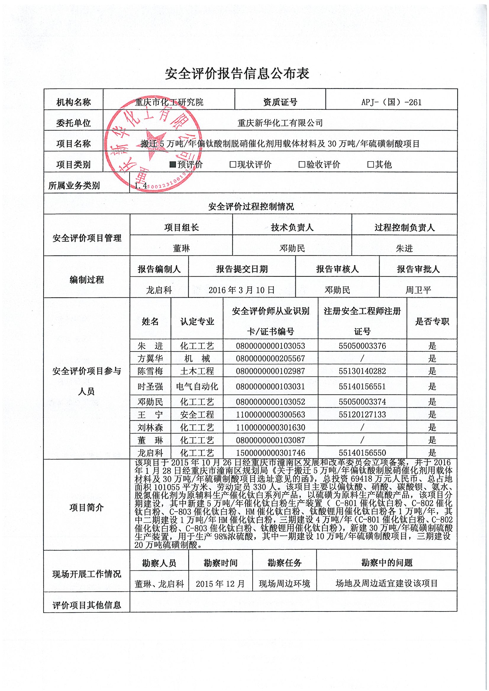 2016年2季度-重庆新华化工有限公司 搬迁5万吨/年偏钛酸制脱硝催化剂用载体材料及30万吨/年硫磺制酸项目 安全预评价