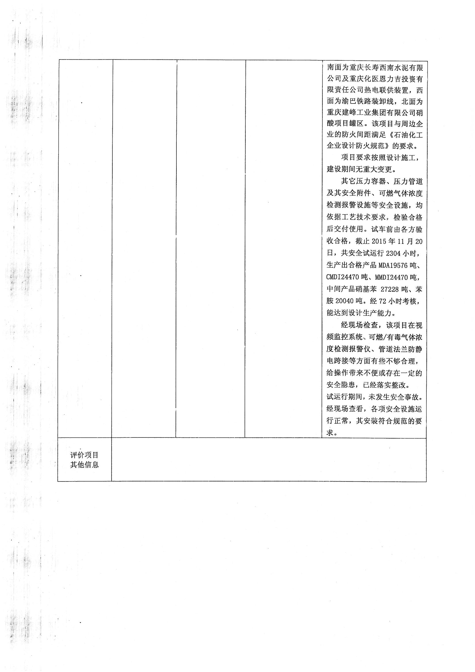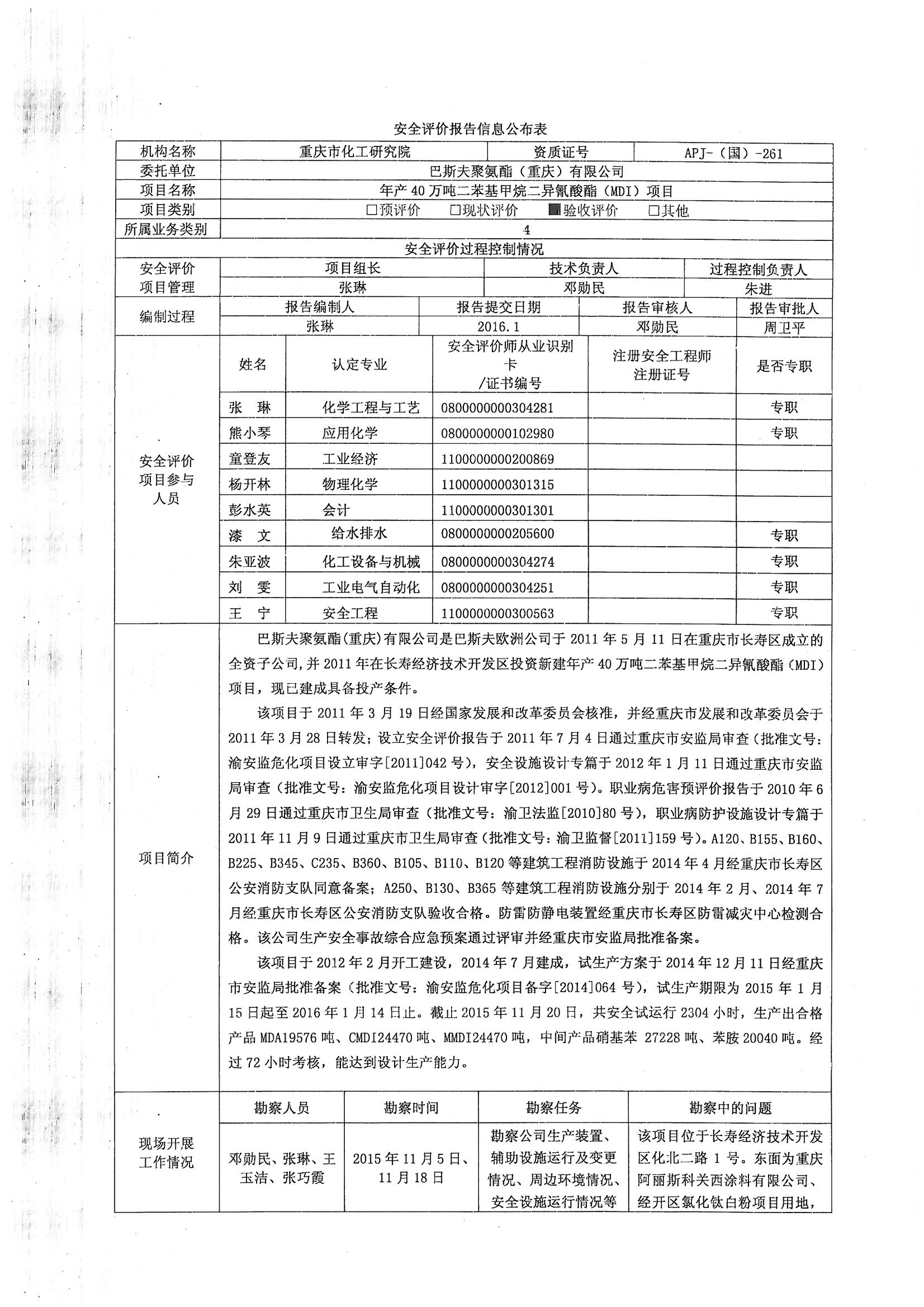 2016年2季度-巴斯夫聚氨酯(重庆)有限公司 年产40万吨二苯基甲烷二异氰酸酯(MDI)项目 安全验收评价