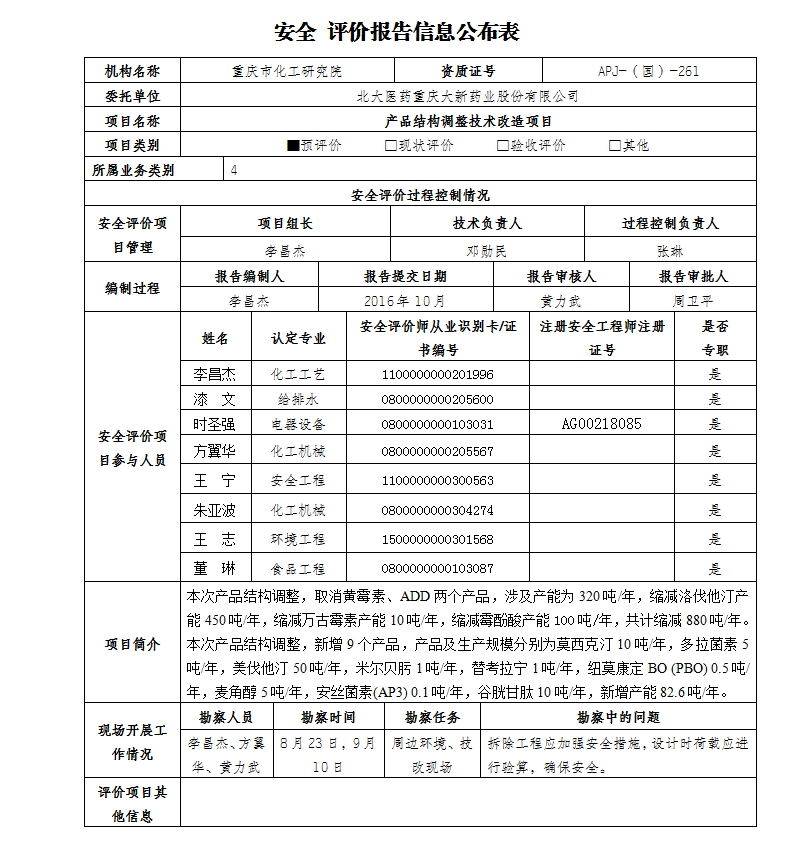 2016年4季度-北大医药重庆大新药业股份有限公司预评价