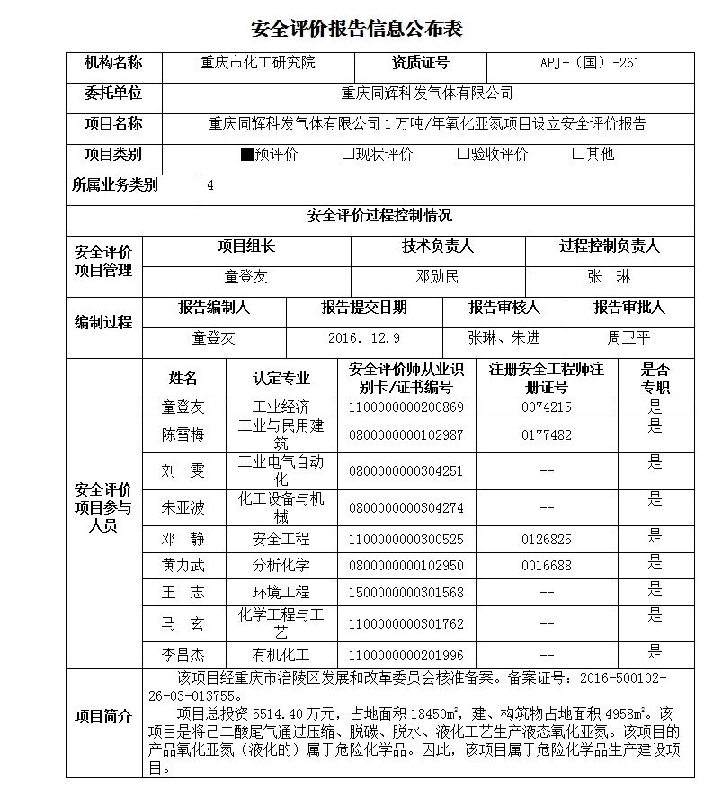 2016年4季度重庆同辉科发气体有限公司1万吨/年氧化亚氮项目设立安全评价