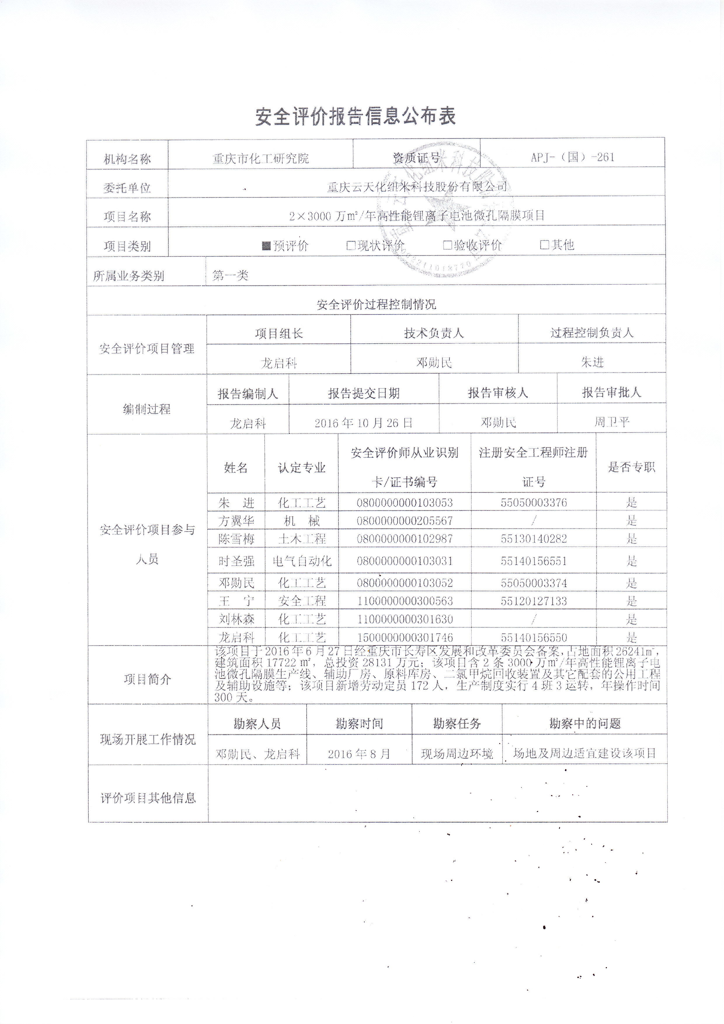 2016年4季度云天化纽米科技股份有限公司2×3000万m2/年高性能锂电子电池微孔隔膜项目预评价