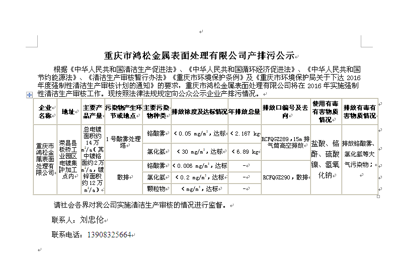 重庆市鸿松金属表面处理有限公司产排污公示