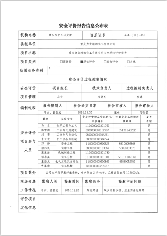 2017年1季度力宏精细化工有限公司安全现状评价信息公布表