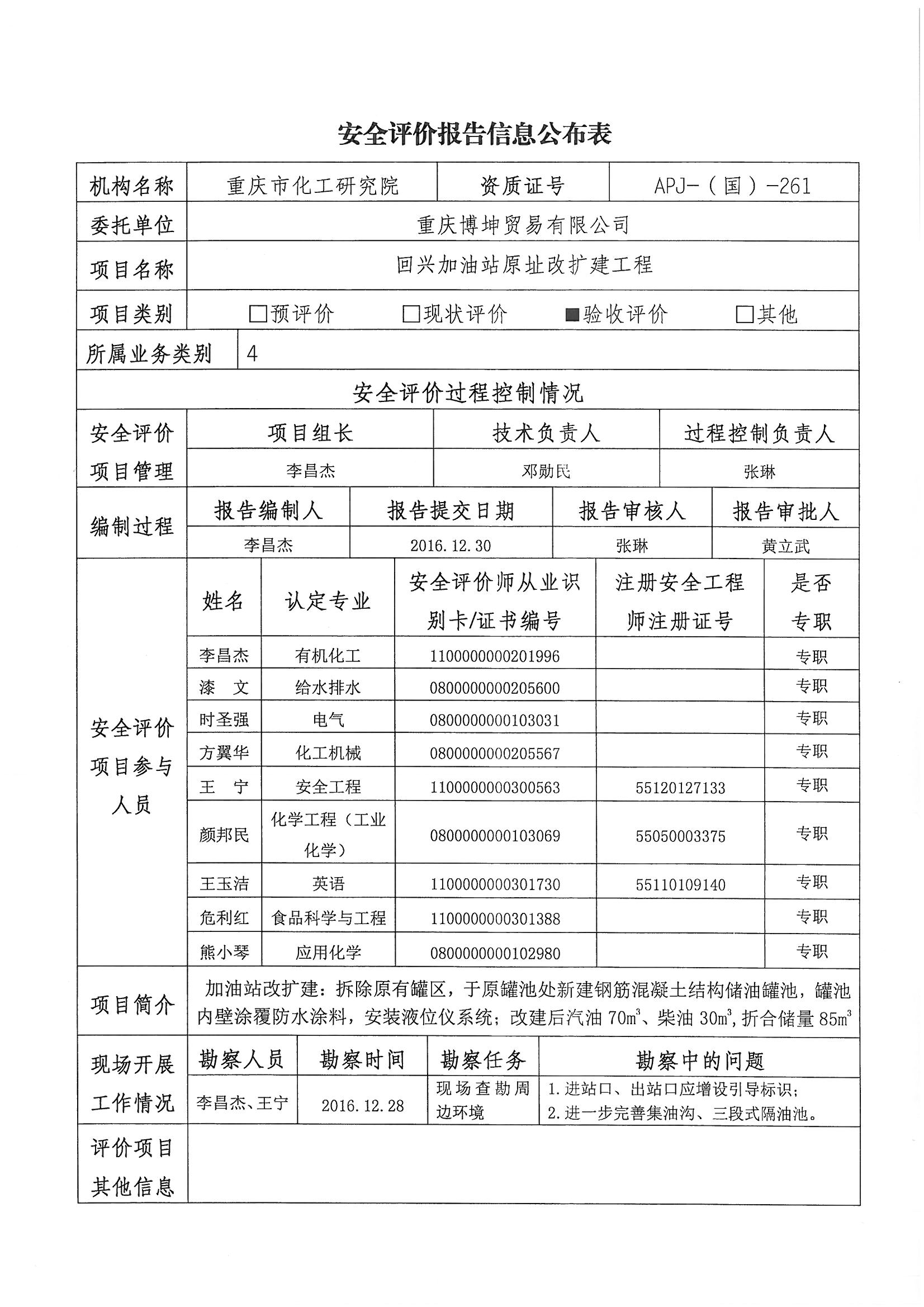 2017年1季度重庆博坤贸易有限公司回兴加油站原址改扩建工程验收评价信息公布表