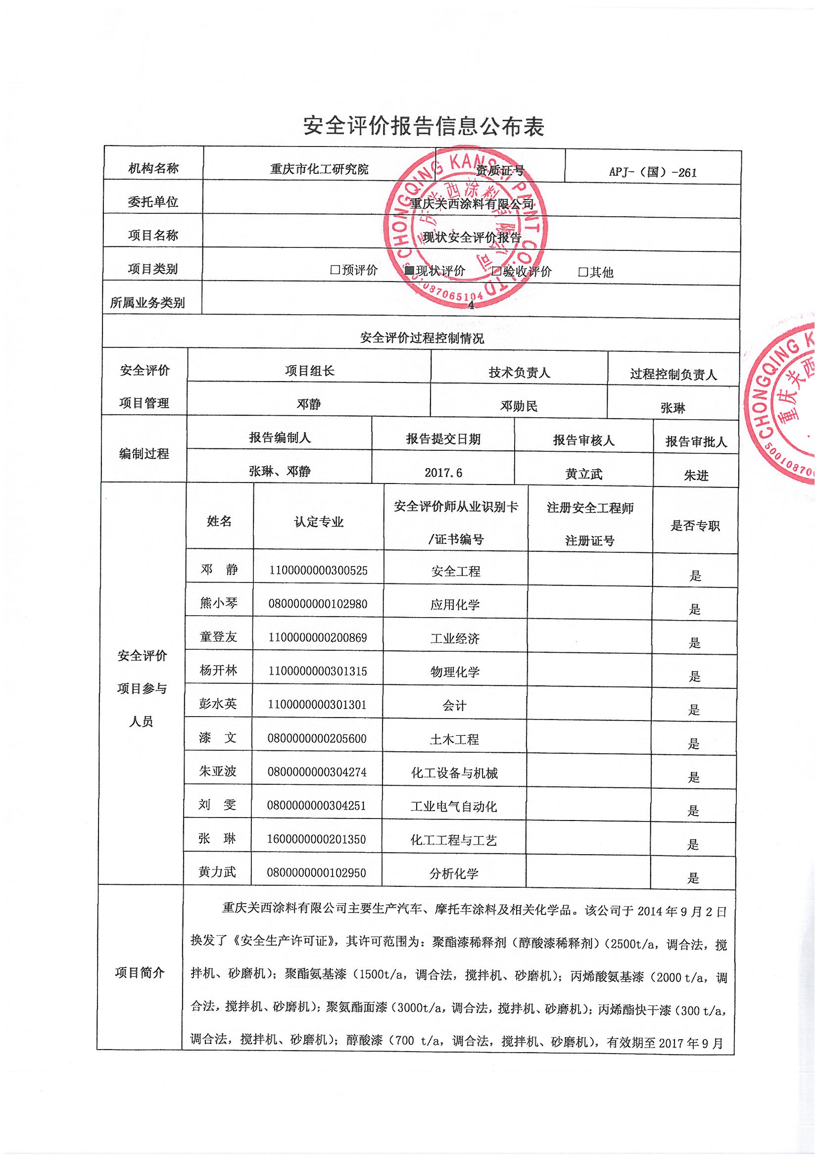 2017年2季度重庆关西涂料有限公司现状安全评价报告