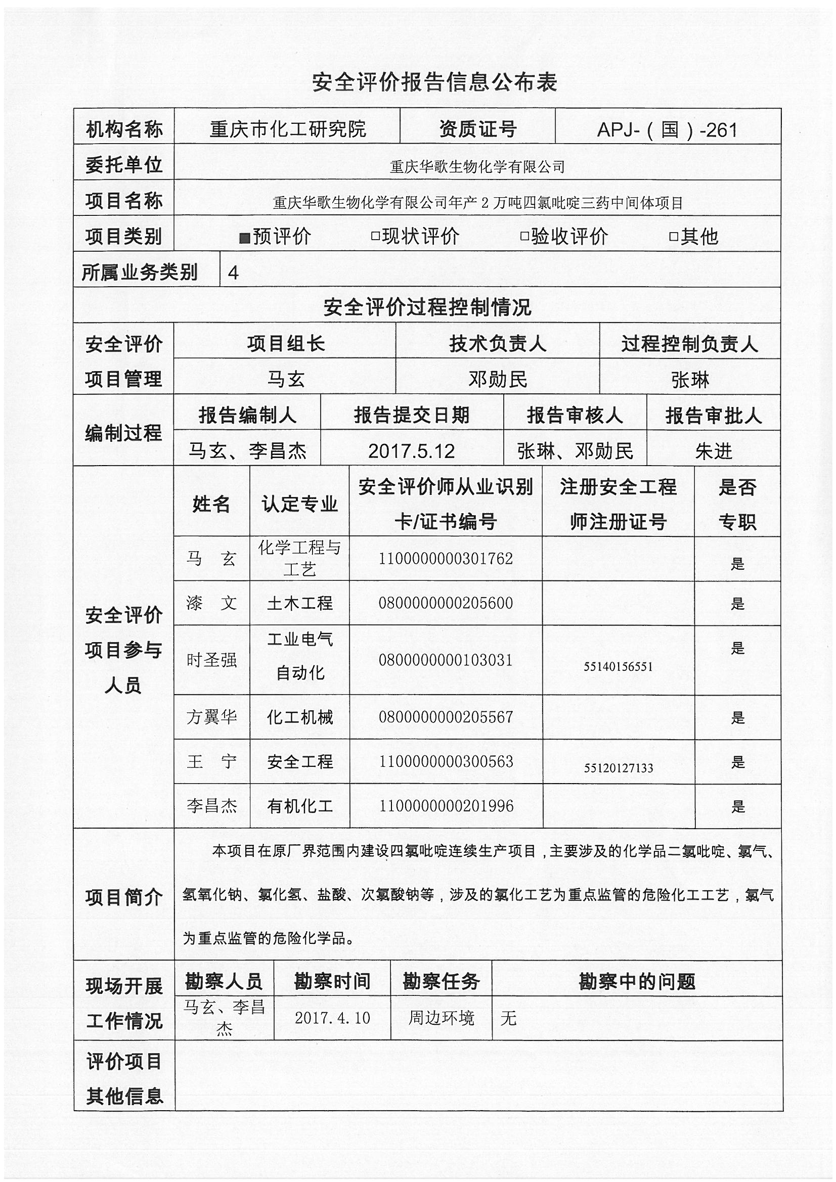 2017年2季度重庆华歌生物化学有限公司年产2万吨四氯吡啶三药中间体项目