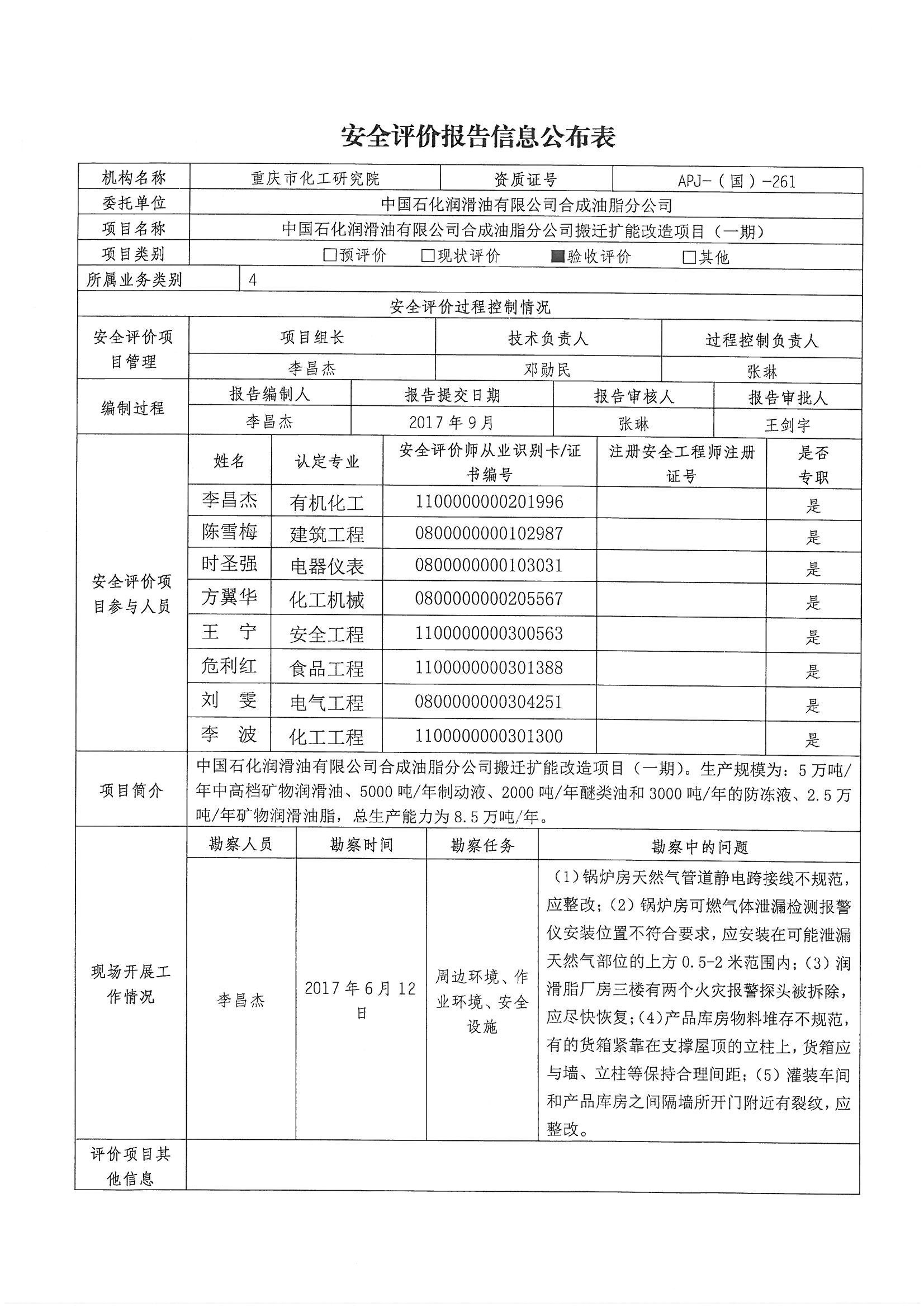 2017年3季度中石化润滑油公司合成油脂分公司验收安全评价报告