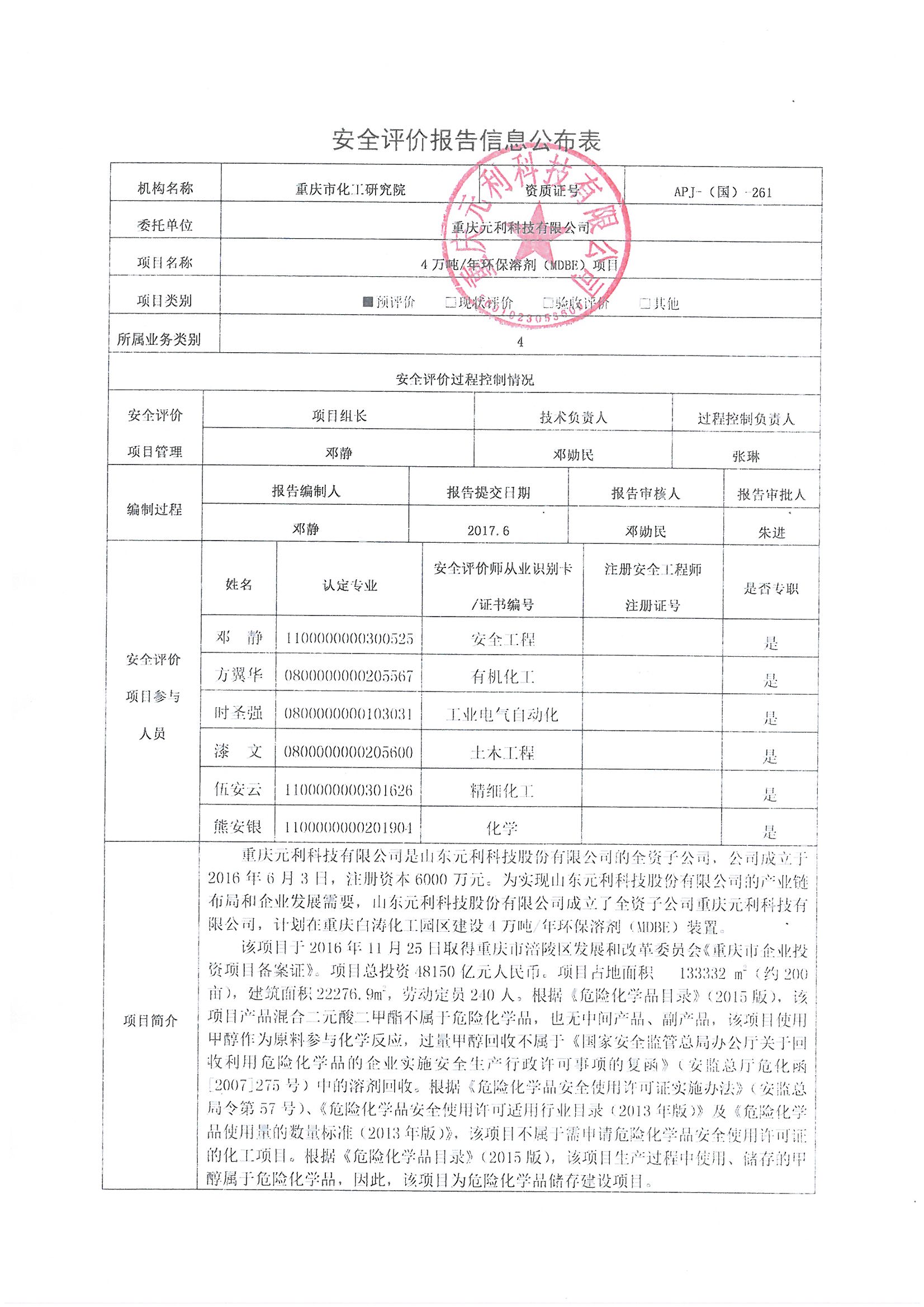 2017年3季度重庆元利科技有限公司4万吨/年环保溶剂(MDBE)项目设立安全评价报告