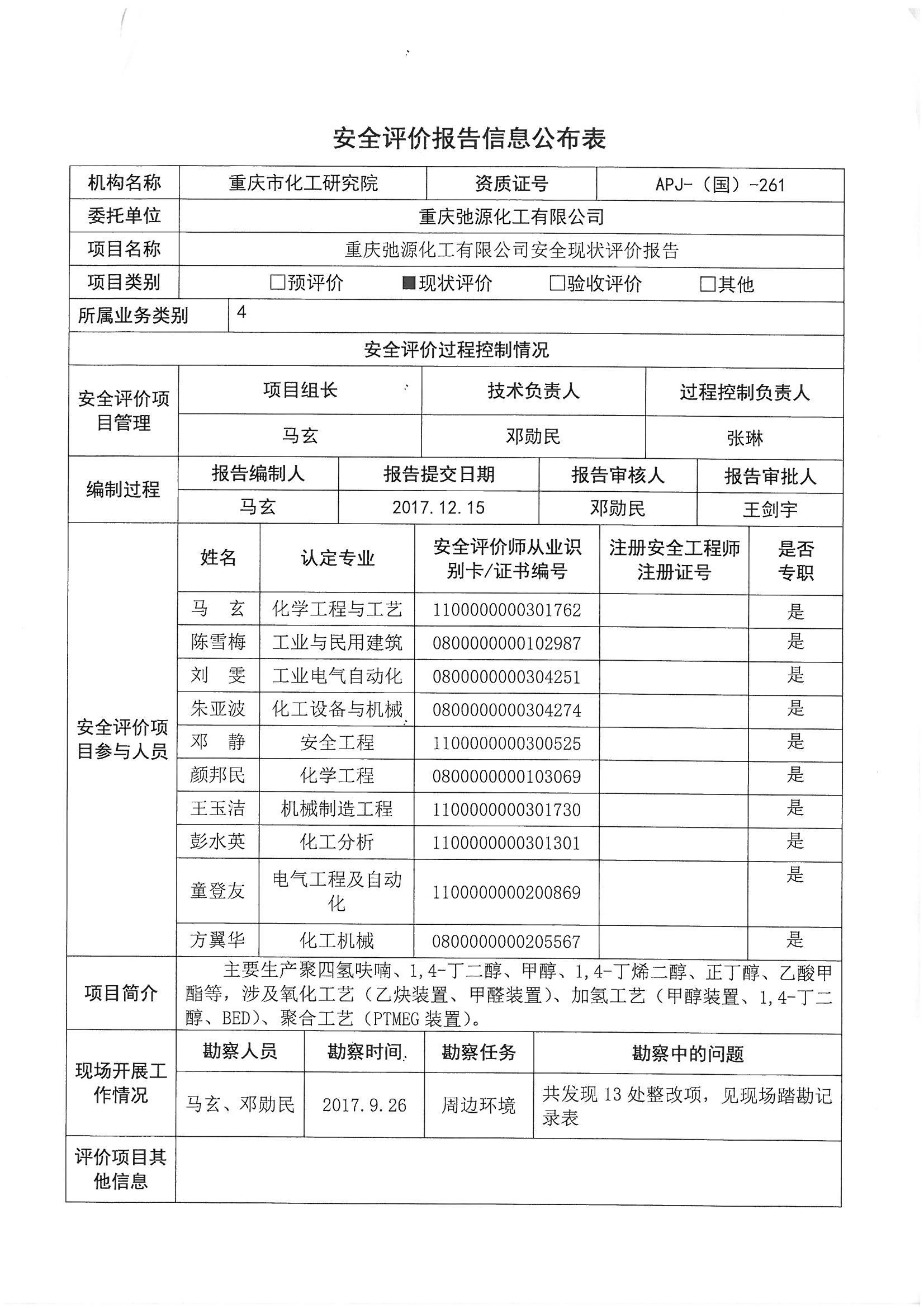 2017年第4季度重庆弛源化工有限公司安全现状评价