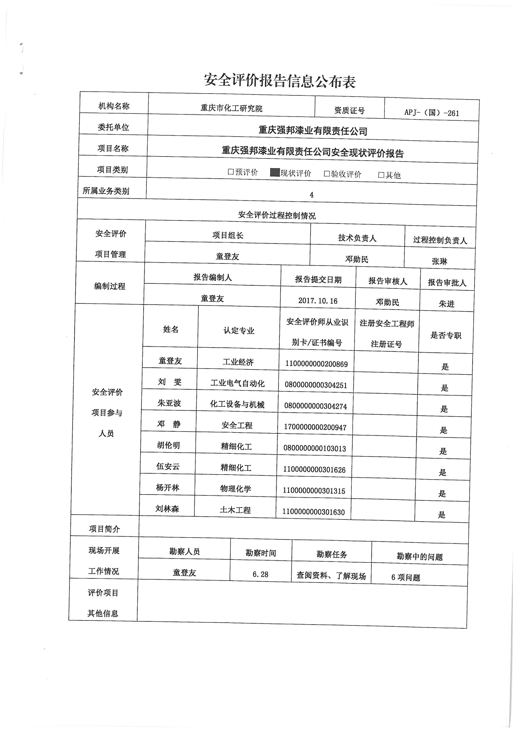 2017年第4季度重庆强邦漆业有限责任公司安全现状评价