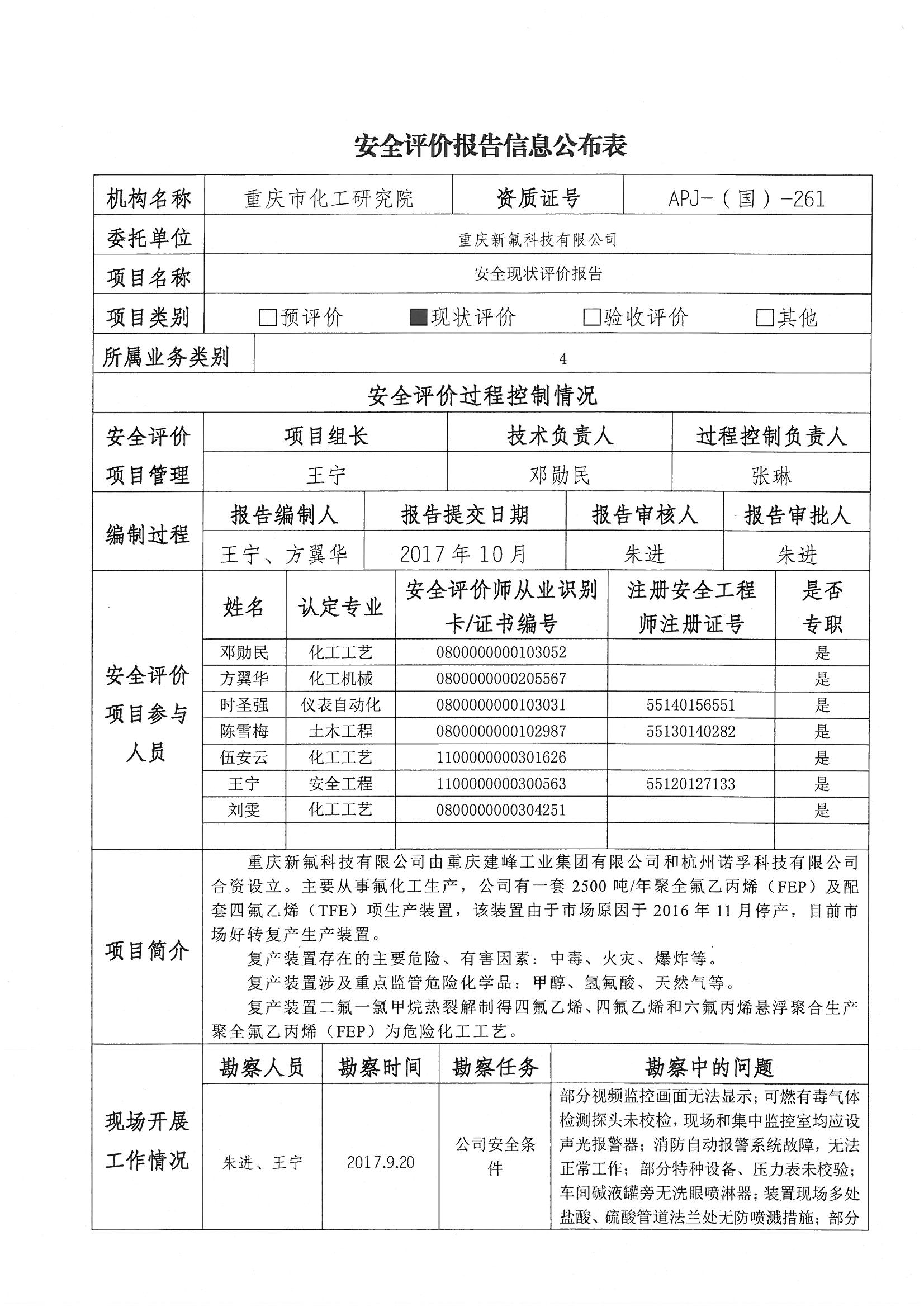2017年第4季度重庆新氟科技有限公司安全现状评价