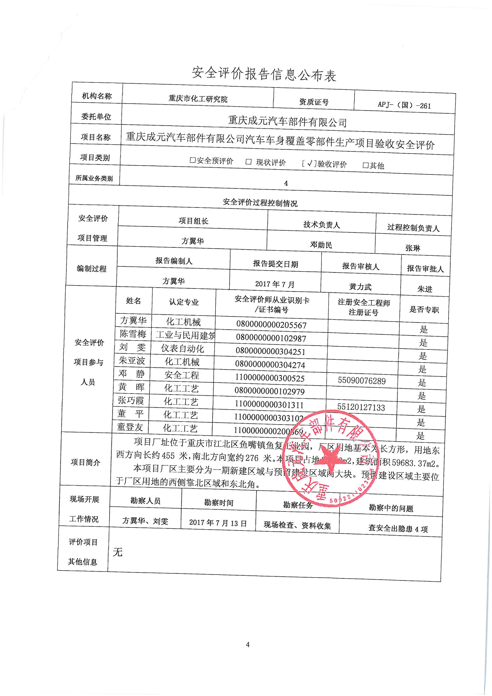 2018年第1季度重庆成元汽车部件有限公司汽车车身覆盖零部件生产项目验收安全评价