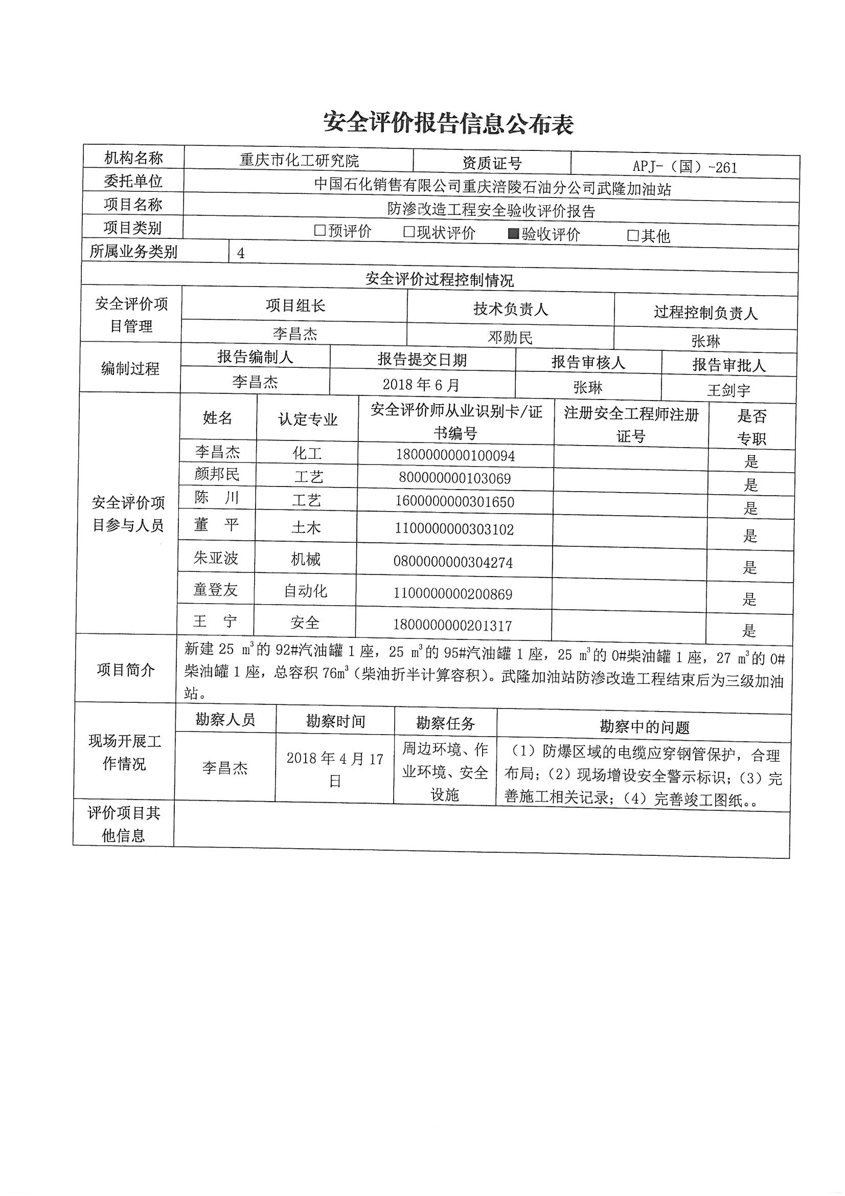 2018年第2季度中石化销售有限公司重庆涪陵石油分公司武隆加油站