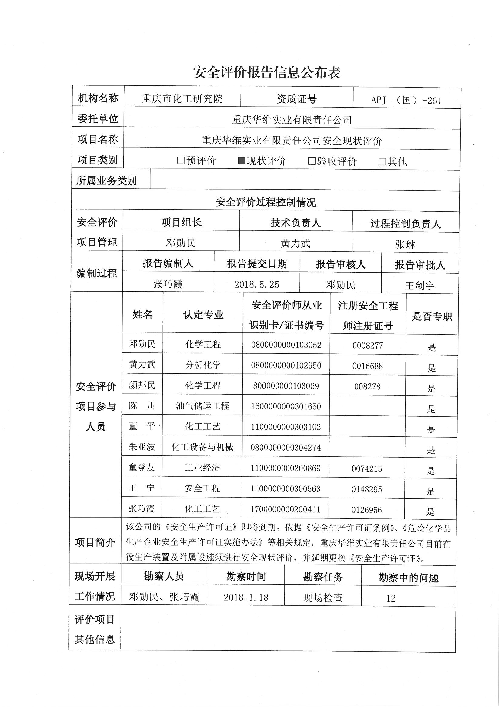 2018年第2季度重庆华维实业有限责任公司安全现状评价报告