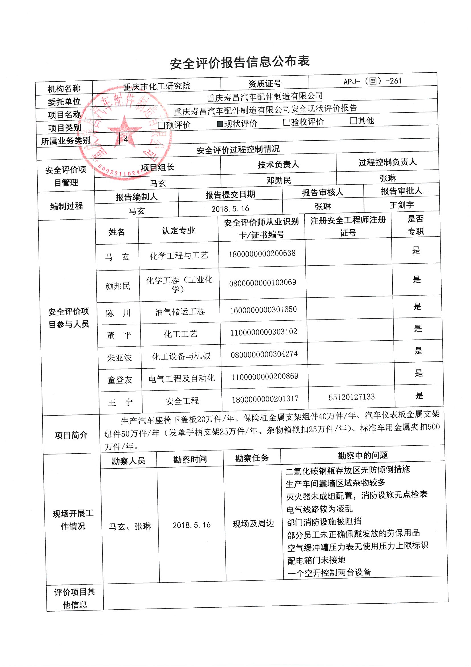 2018年第2季度重庆寿昌汽车配件制造有限公司安全现状评价报告