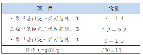 三羟甲基丙烷二烯丙基醚,英文名Trimethylolpropane diallylether。 分子结构有两个双键和一个羟基,是一种优良的气干剂,广泛应用 于不饱和聚酯树脂、原子灰树脂、醇酸树脂、聚氨酯树脂、环氧树 脂、水溶性树脂等。