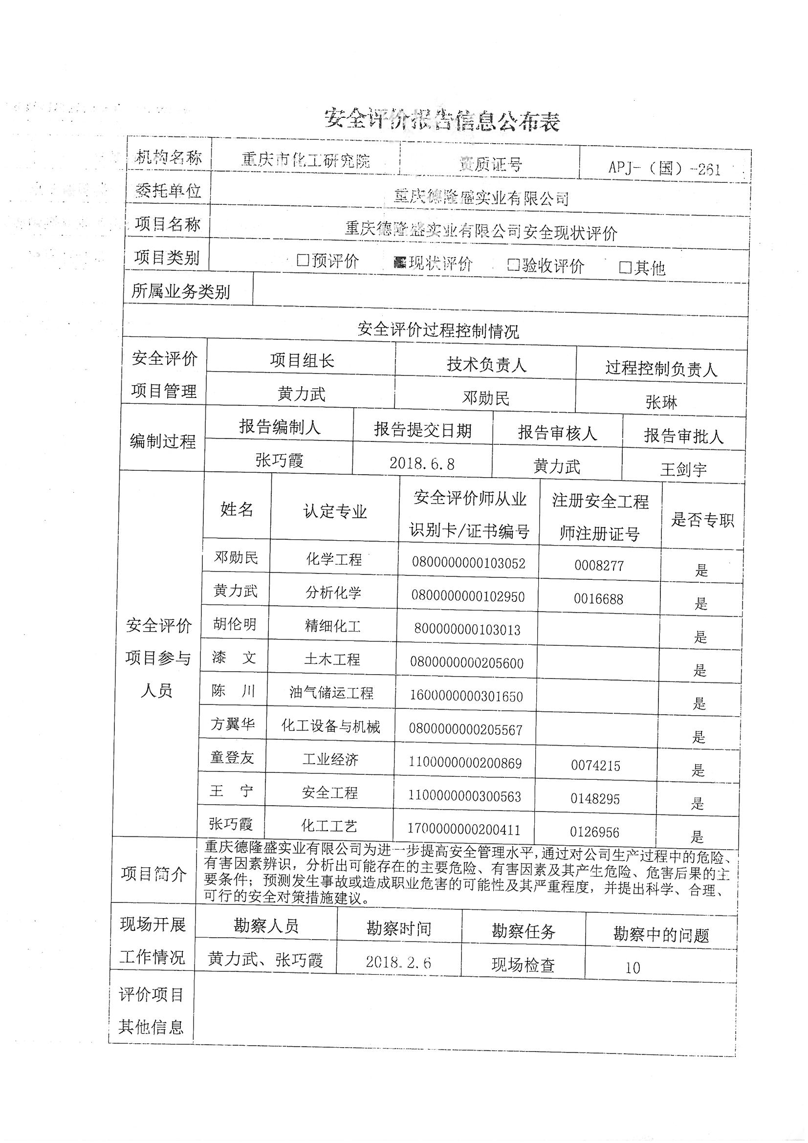 2018年第三季度重庆德隆盛实业有限公司安全现状评价