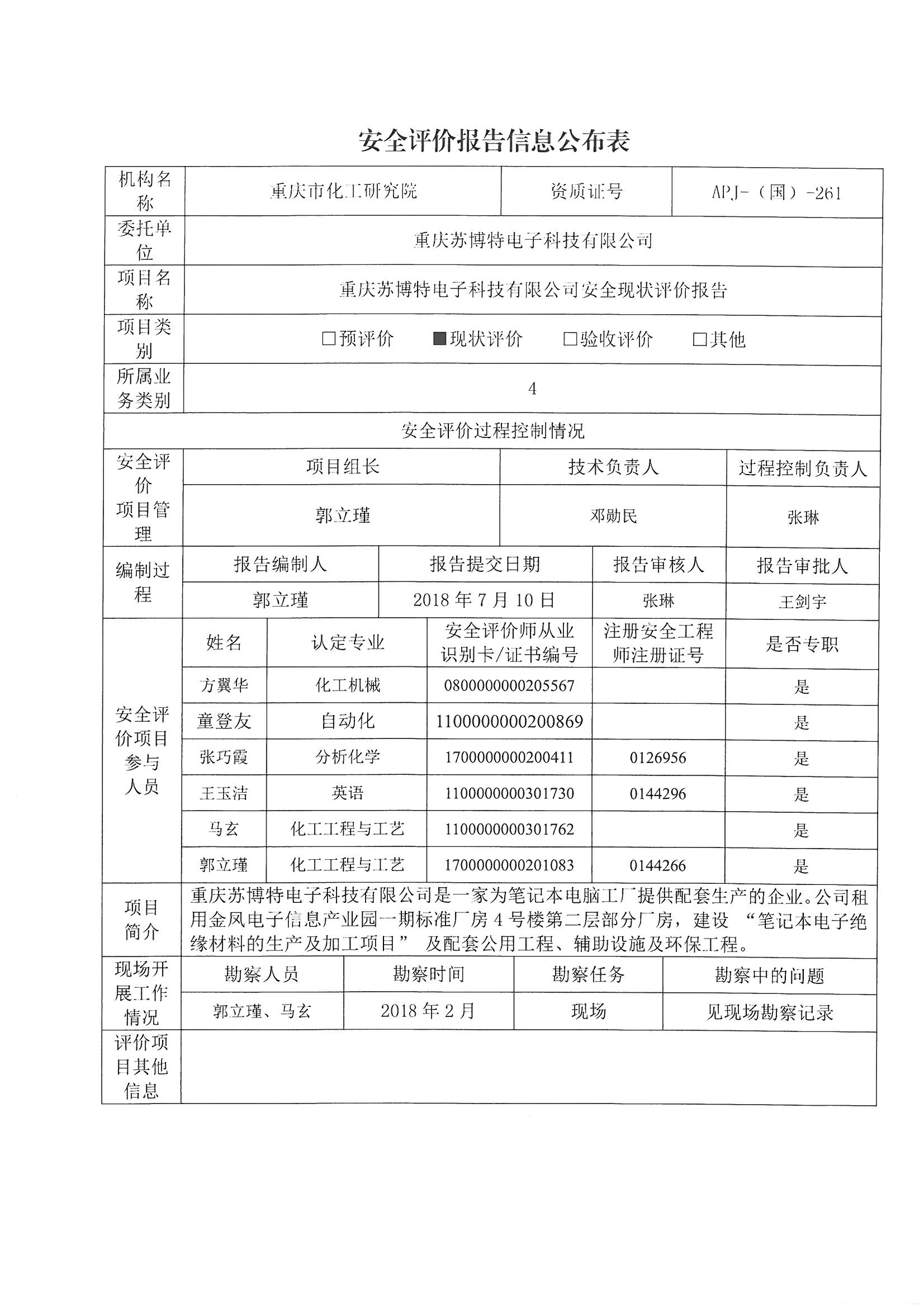 2018年第三季度重庆苏博特电子科技有限公司安全现状评价