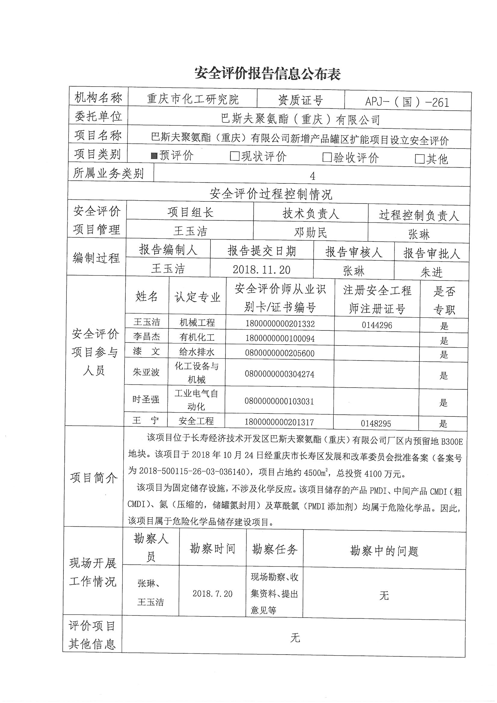 2018年第四季度巴斯夫聚氨酯(重庆)有限公司新增产品罐区扩能项目设立安全评价