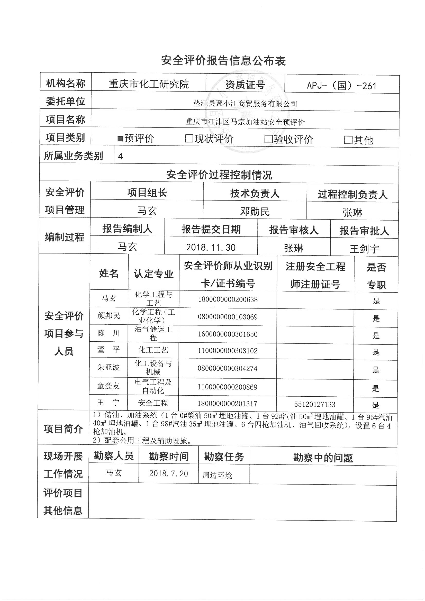 2018年第四季度垫江县聚小江商贸服务有限公司重庆市江津区马宗加油站安全预评价