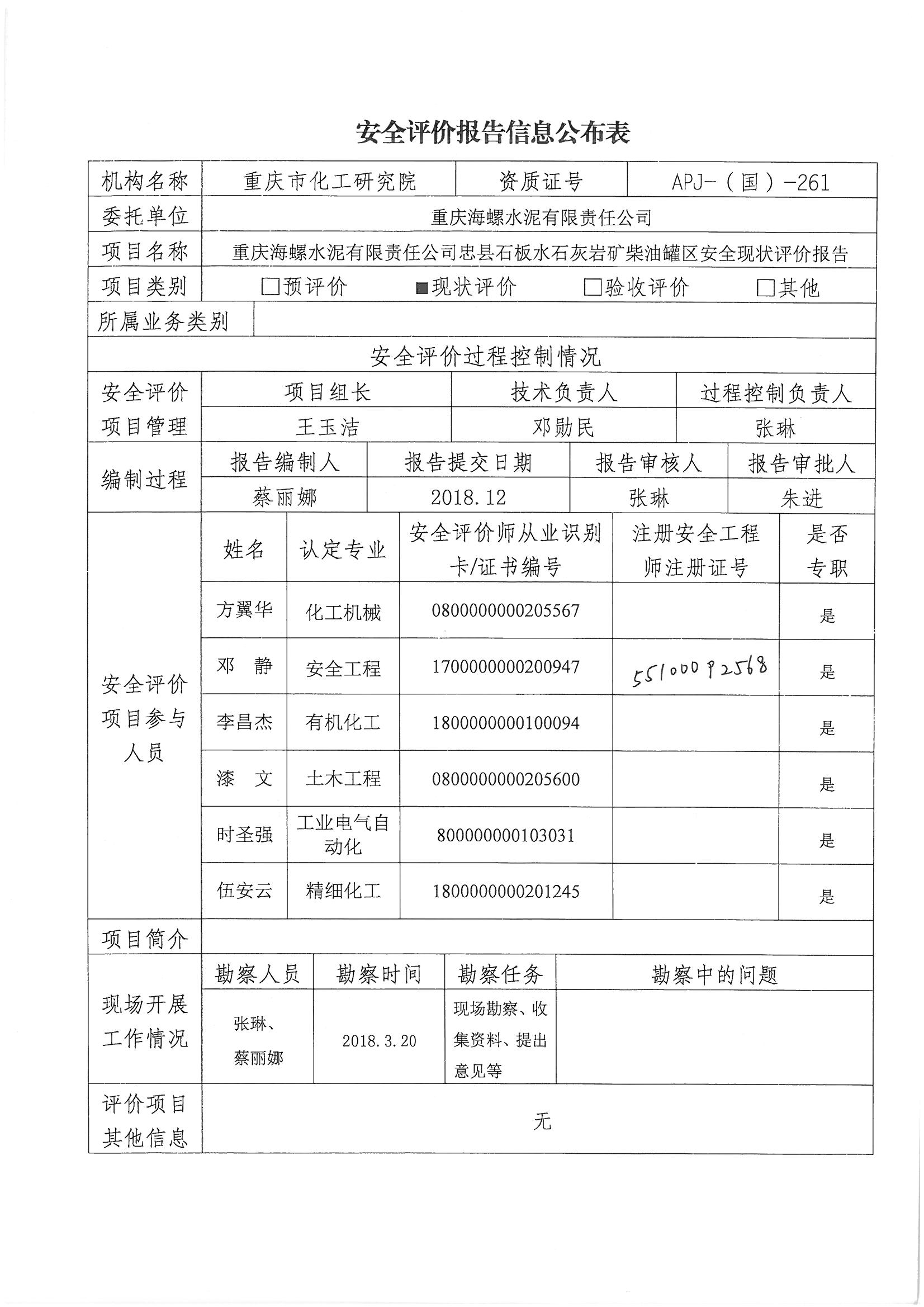 2018年第四季度重庆海螺有限责任公司忠县石板水石灰岩柴油罐区安全现状评价