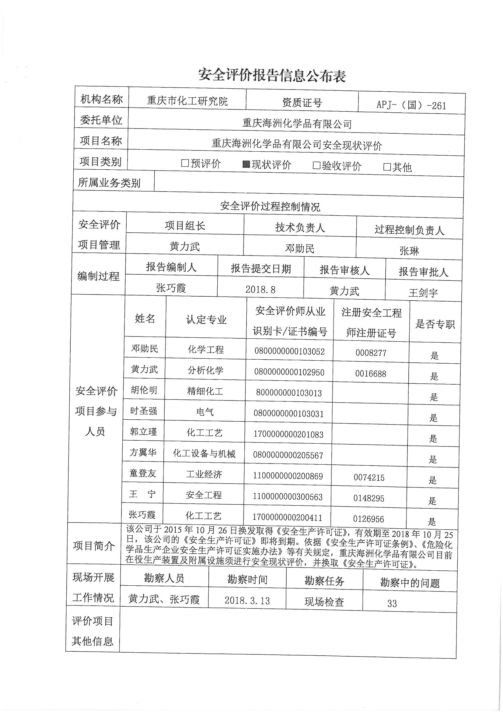 2018年第四季度重庆海州化学品有限公司安全现状评价