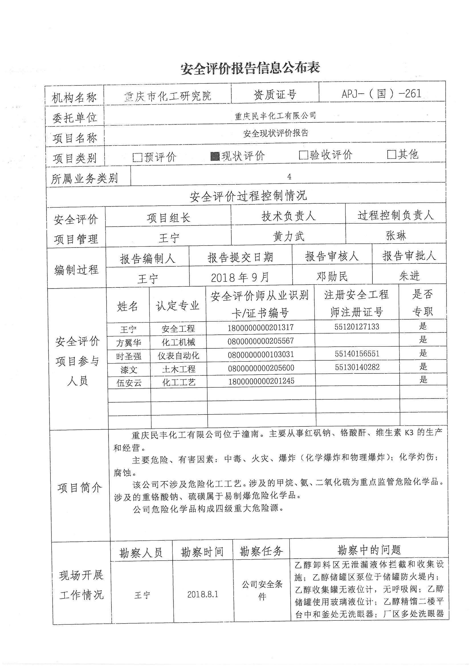 2018年第四季度重庆民丰化工有限公司安全现状评价