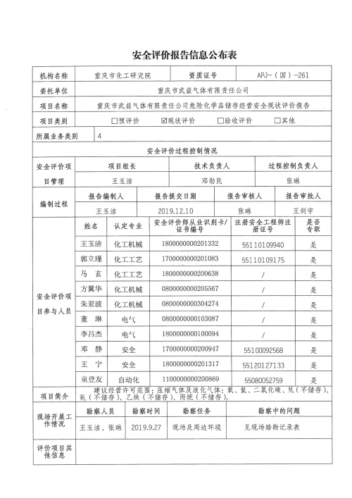 2019年4季度重庆市武益气体有限责任公司(危险化学品储存经营)