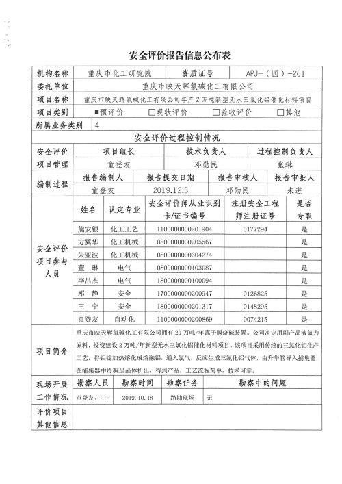 2019年4季度重庆市映天辉氯碱化工有限公司年产2万吨新型无水三氯化铁催化材料项目设立安全评价