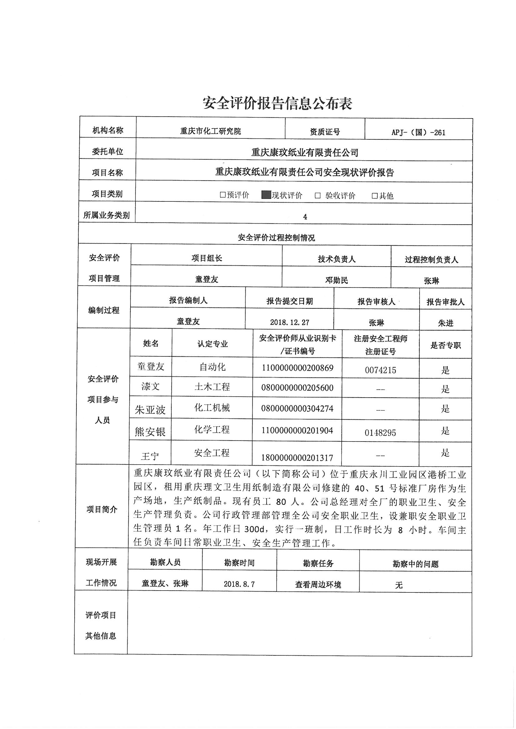 2019年1季度重庆康纹纸业有限责任公司安全现状评价