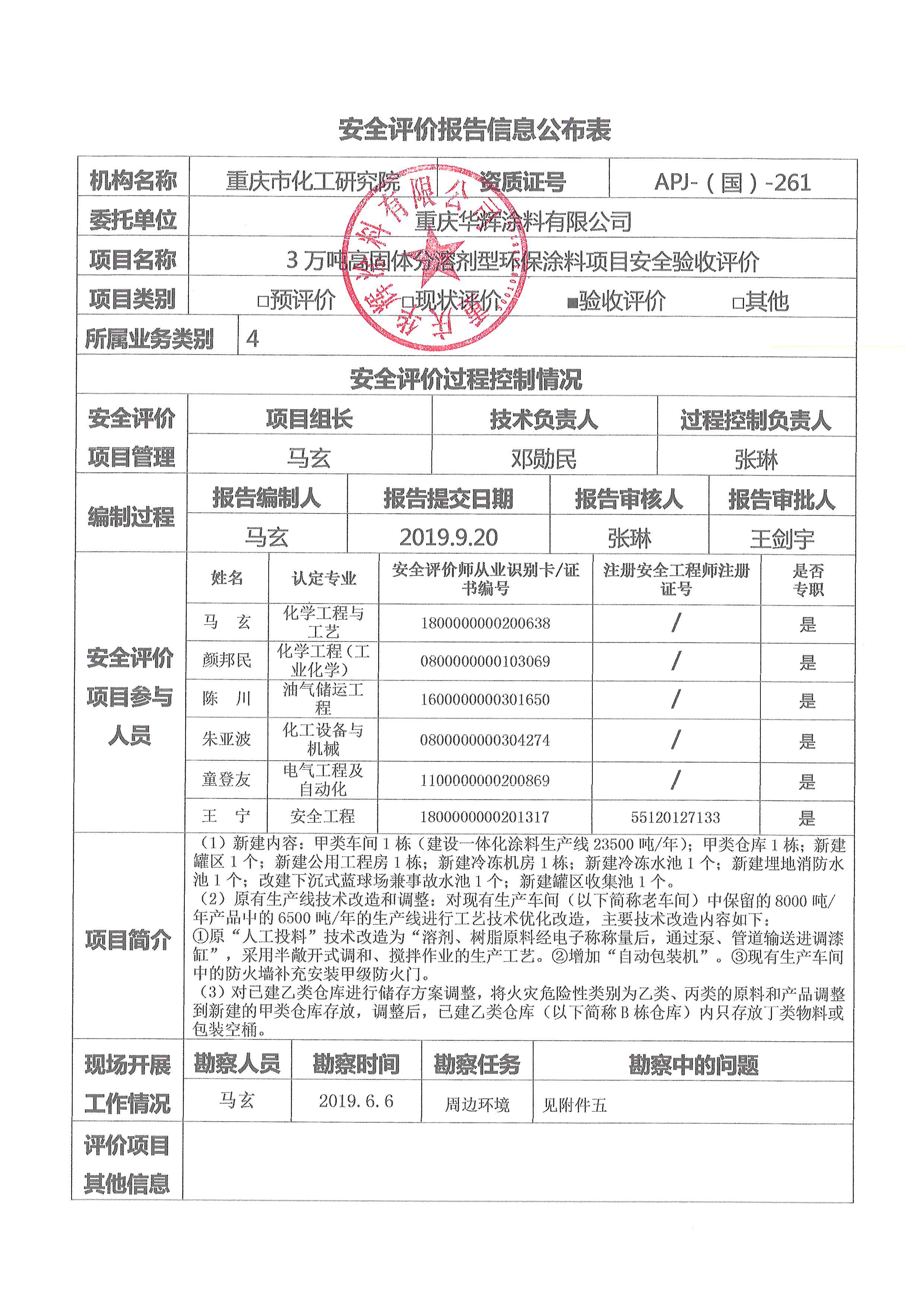 2019第3季度重庆华辉涂料有限公司安全验收评价
