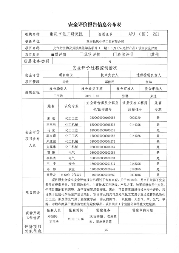 2020第一季度重庆长风化学工业有限公司光气衍生物及芳胺类化学品项目(一期项目)设立安全评价