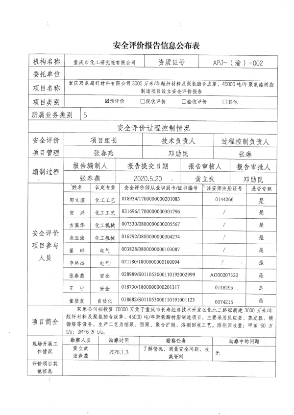 2020第2季度重庆双象超纤材料有限公司3000万米年超纤材料及聚氨酯合成革45000吨年聚氨酯树脂制造项目