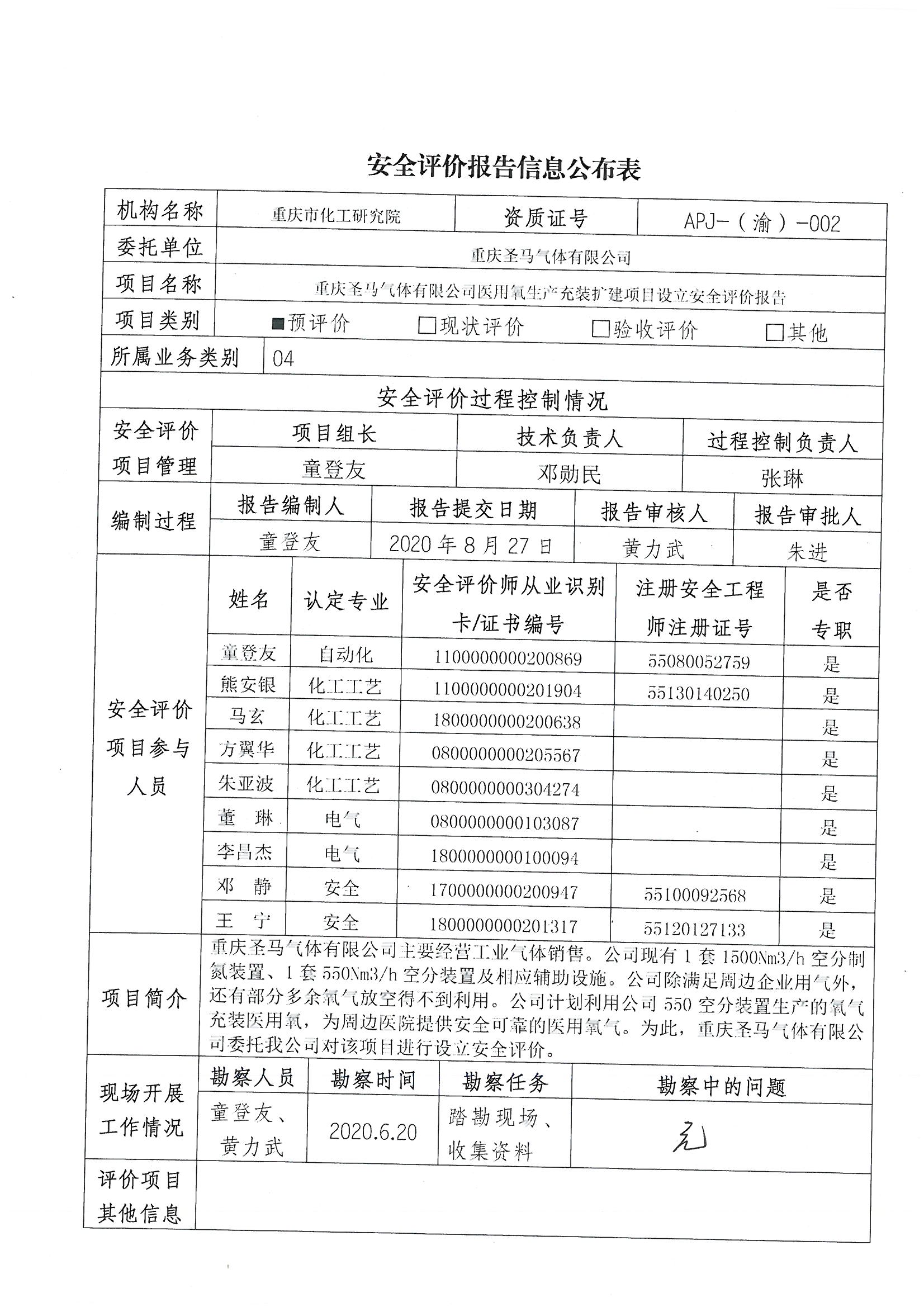 2020第3季度重庆圣马气体有限公司医用氧生产充装扩建项目