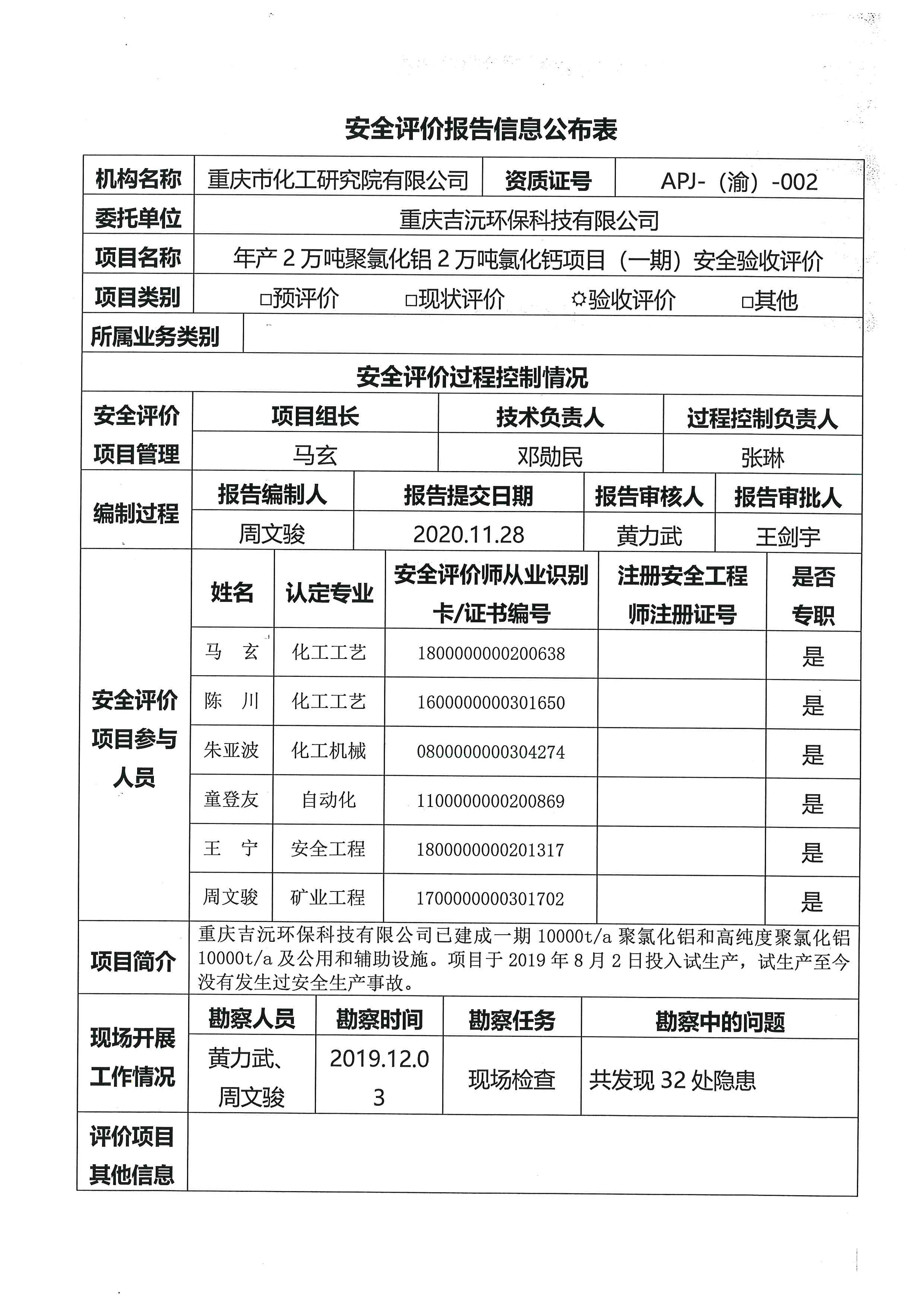2020年第四季度重庆吉沅环保科技有限公司年产2万吨聚氯化铝2万吨氯化钙项目(一期)安全验收评价