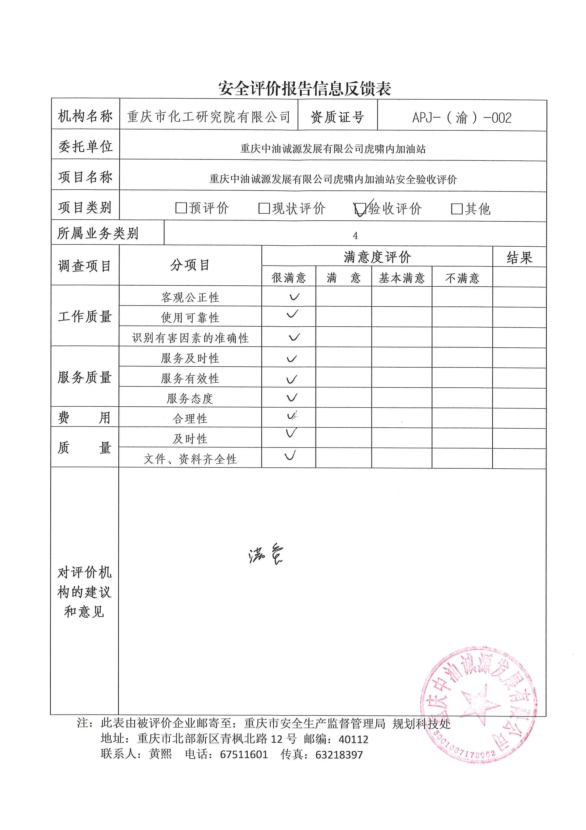 2020年第四季度重庆中油诚源发展有限公司虎啸内加油站安全验收评价