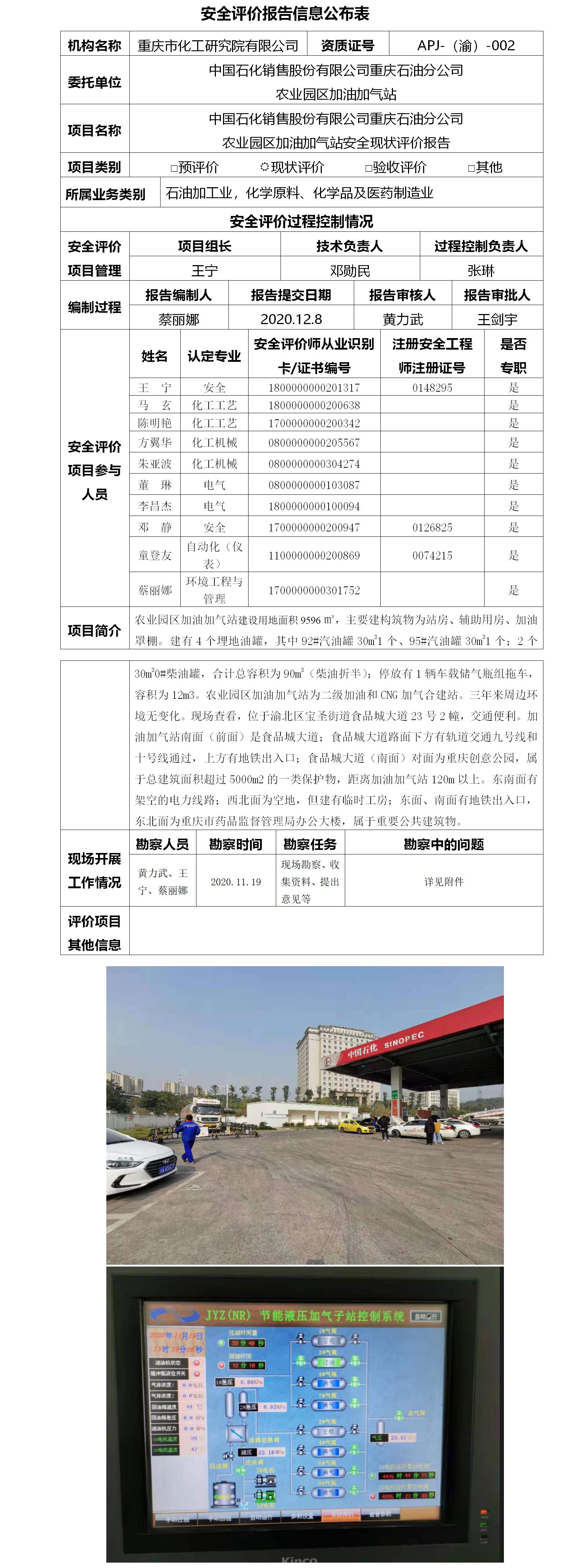 2020年4季度中国石化销售股份有限公司重庆石油分公司农业园区加油加气站安全现状评价-信息公布表