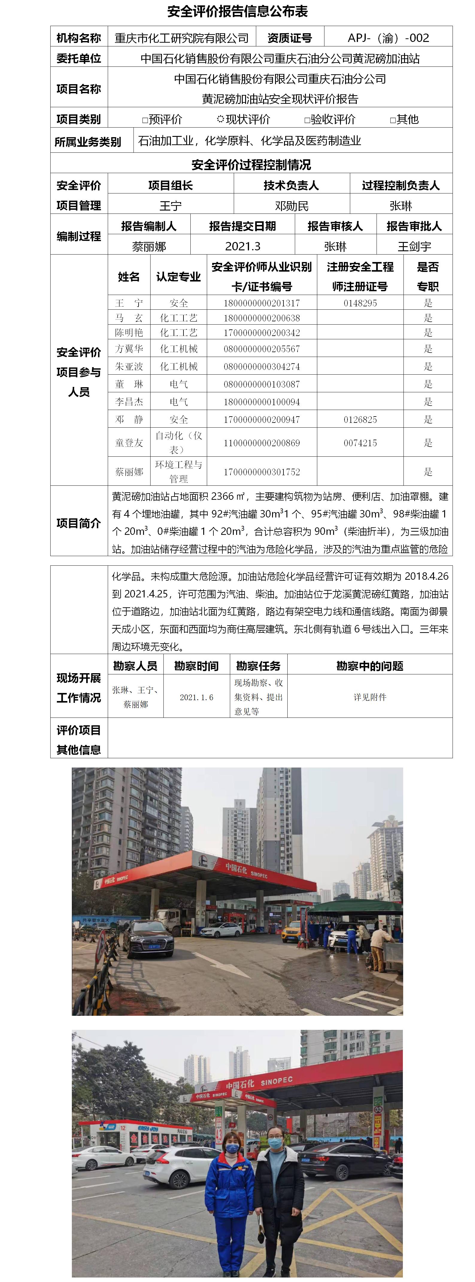 2021年1季度中国石化销售股份有限公司重庆石油分公司黄泥磅加油站安全现状评价-信息公布表