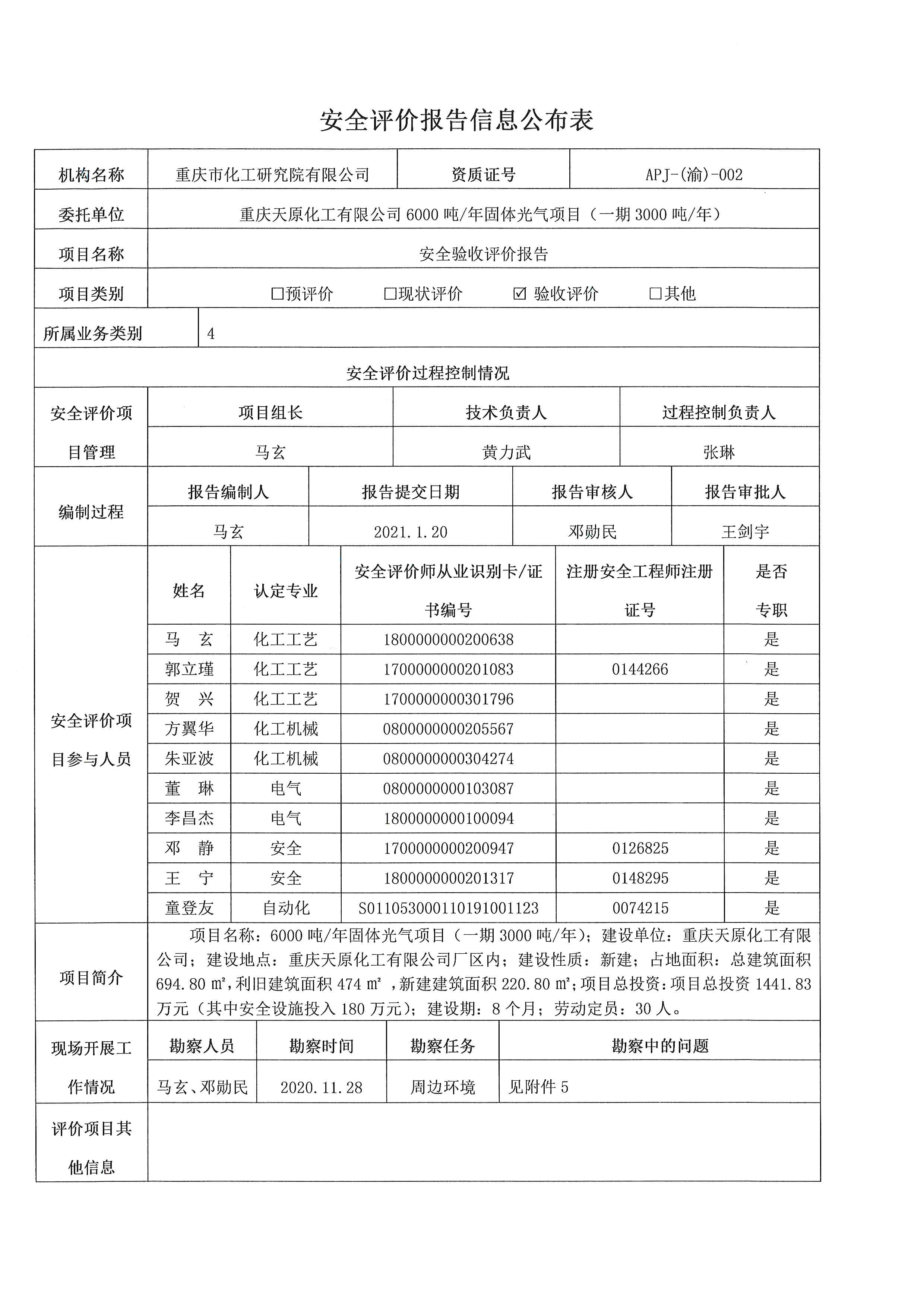 2021年第1季度重庆天原化工有限公司6000吨每年固体光气项目(一期3000吨每年)