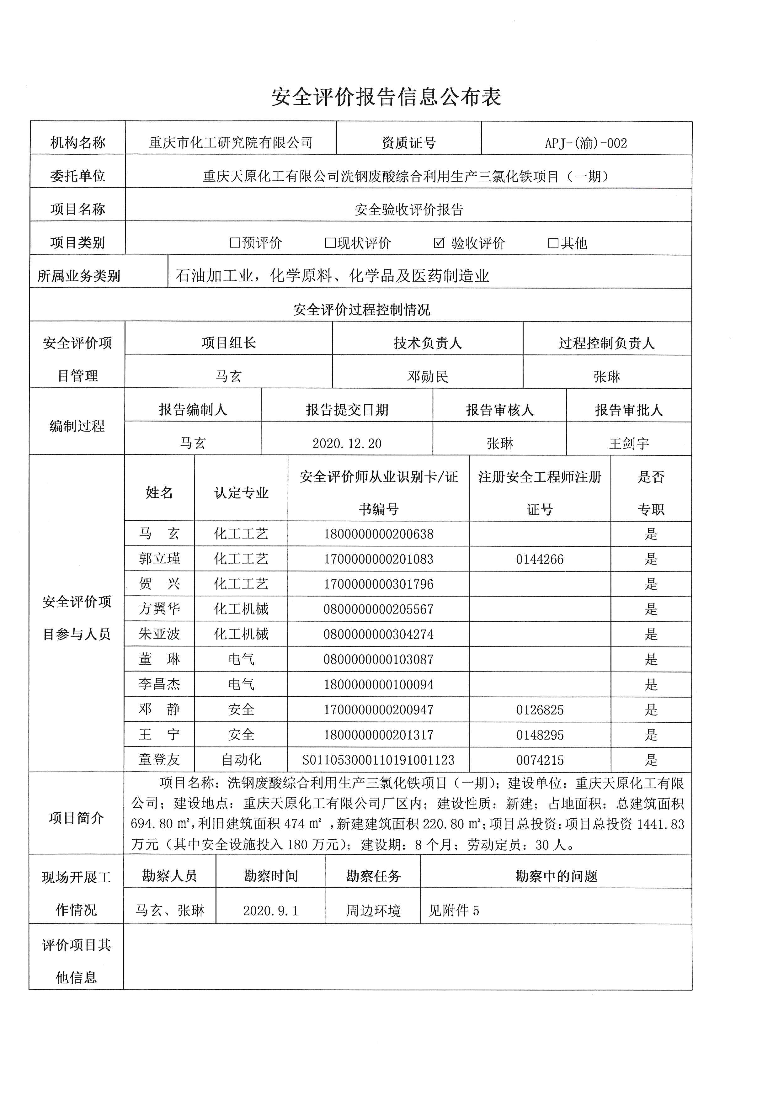 2021年第1季度重庆天原化工有限公司洗刚废酸综合利用生产三氯化铁项目(一期)