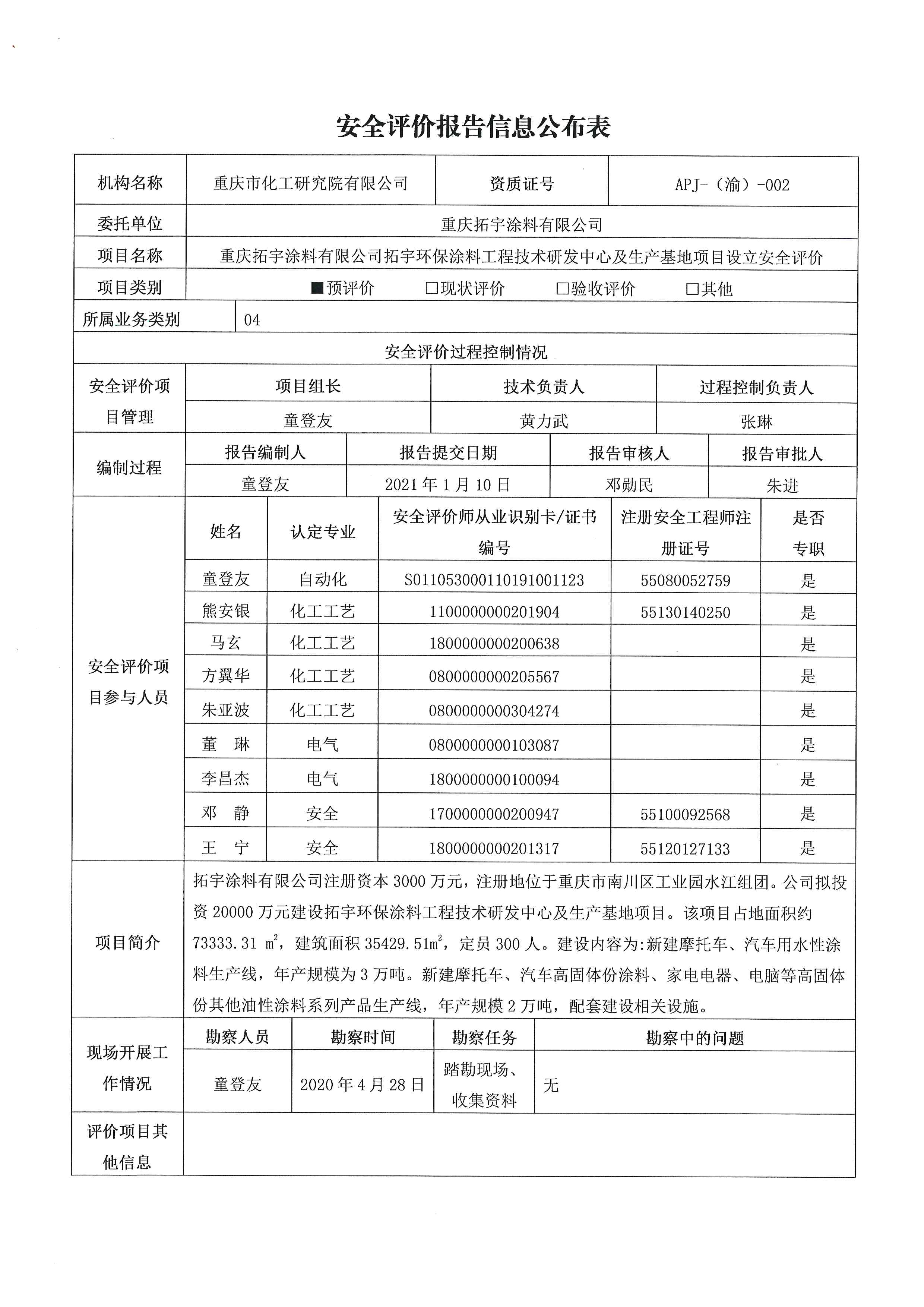 2021年第1季度重庆拓宇涂料有限公司拓宇环保涂料工程技术研发中心及生产基地项目设立安全评价