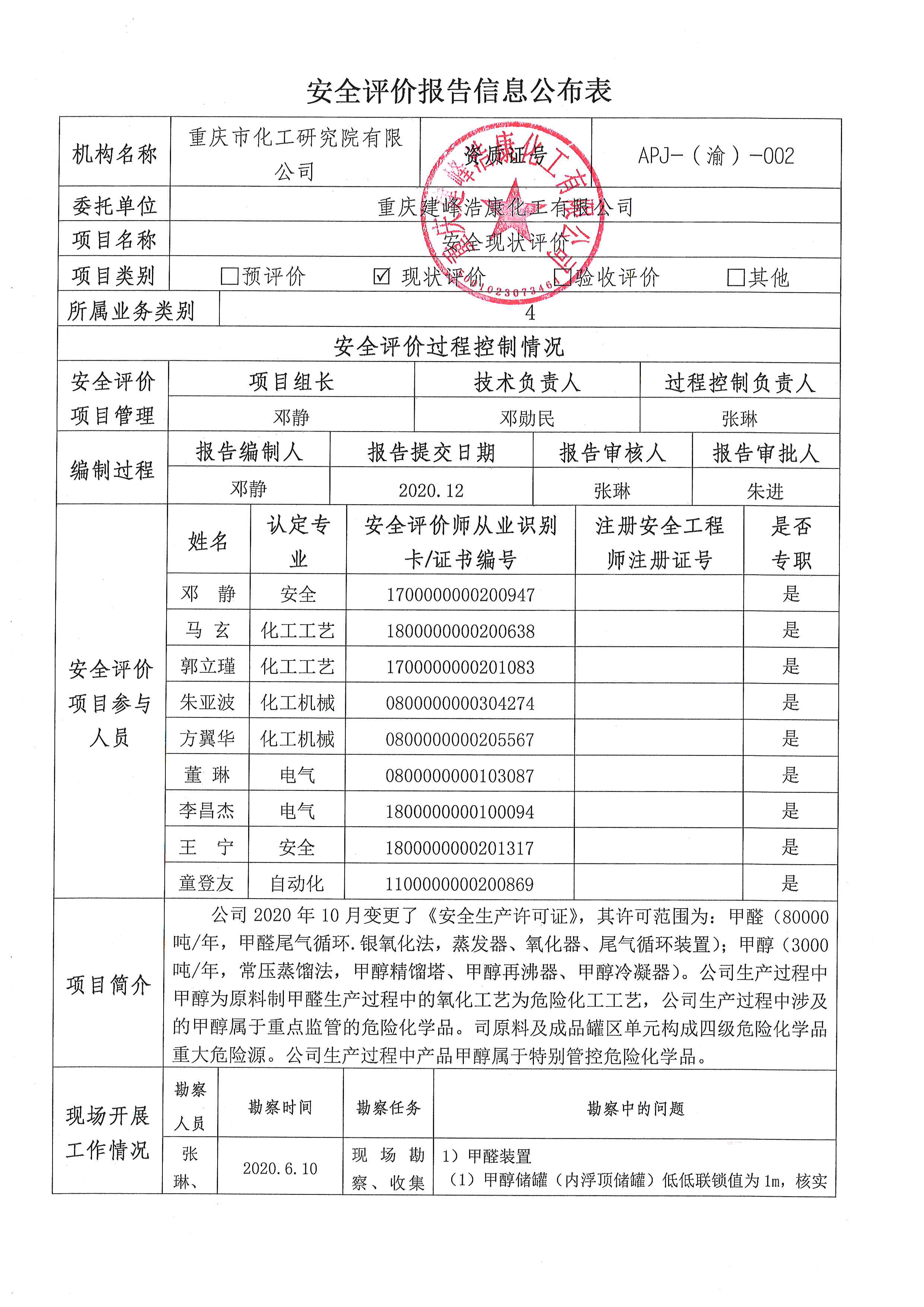 2021年第2季度重庆建峰浩康化工有限公司安全现状评价-信息公布表