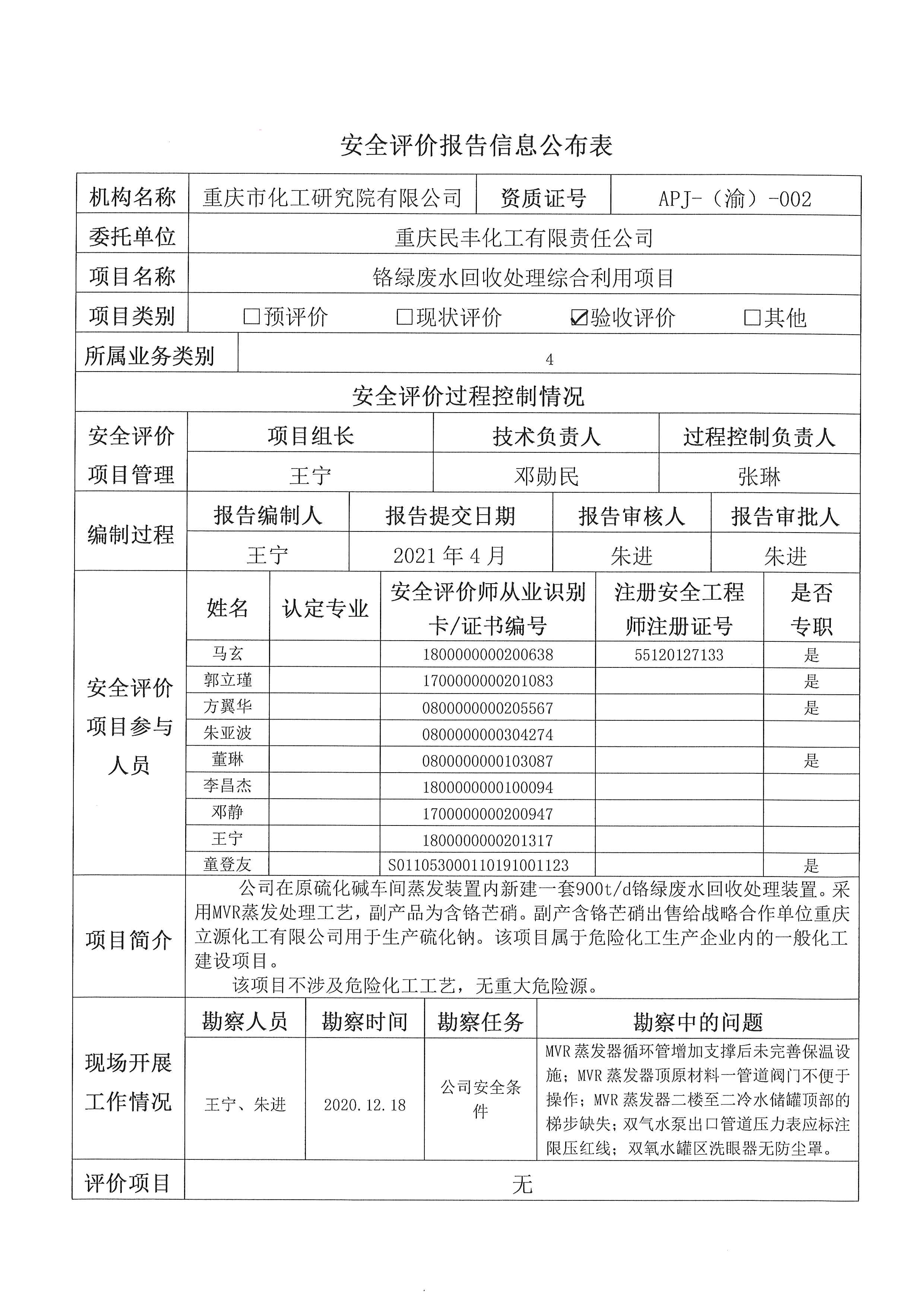 2021年第2季度重庆民丰化工有限责任公司铬绿废水回收处理综合利用项目安全验收评价