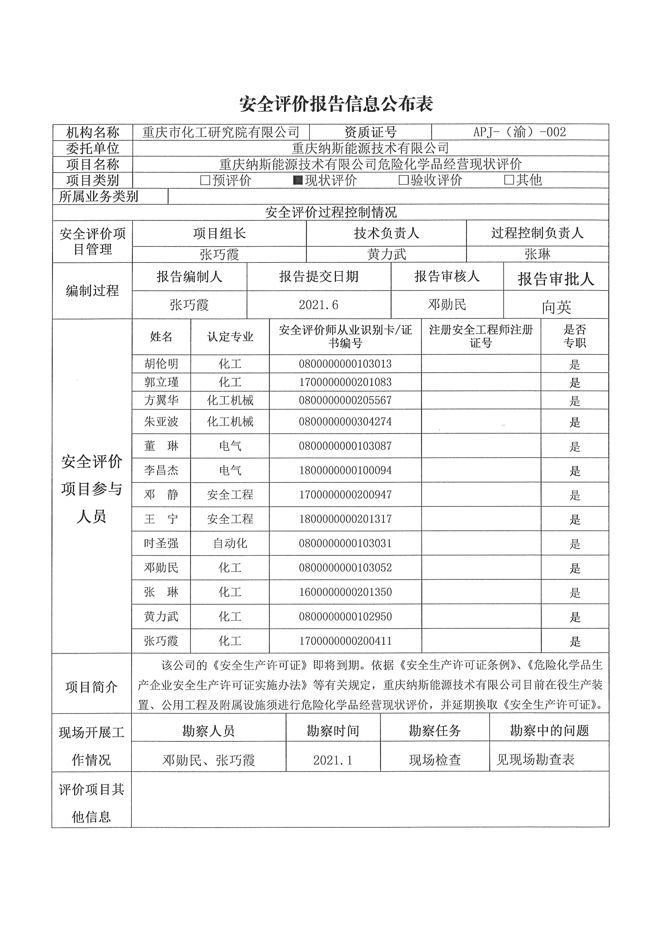 2021年第2季度重庆纳斯能源技术有限公司安全现状评价-信息公布表